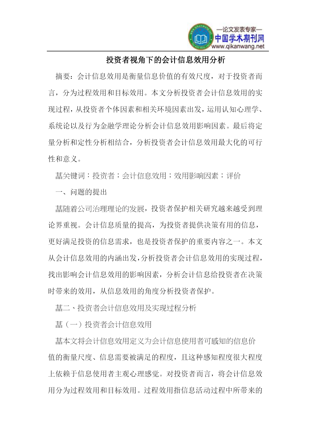 投资者视角下的会计信息效用分析摘要:会计信息效用是衡量信息价值的有效尺度,对于投资者而言,分为过程效用和目标效用。本文分析投资者会计信息效用的实现过程,从投资者个体因素和相关环境因素出发,运用认知心理学、系统论以及行为金融学理论分析会计信息效用影响因素。最后将定量分析和定性分析相结合,分析投资者会计信息效用最大化的可行性和意义。关键词:投资者;会计信息效用;效用影响因素;评价一、问题的提出随着公司治理理论的发展,投资者保护相关研究越来越受到理论界重视。会计信息质量的提高,为投资者提供决策有用的信息,更