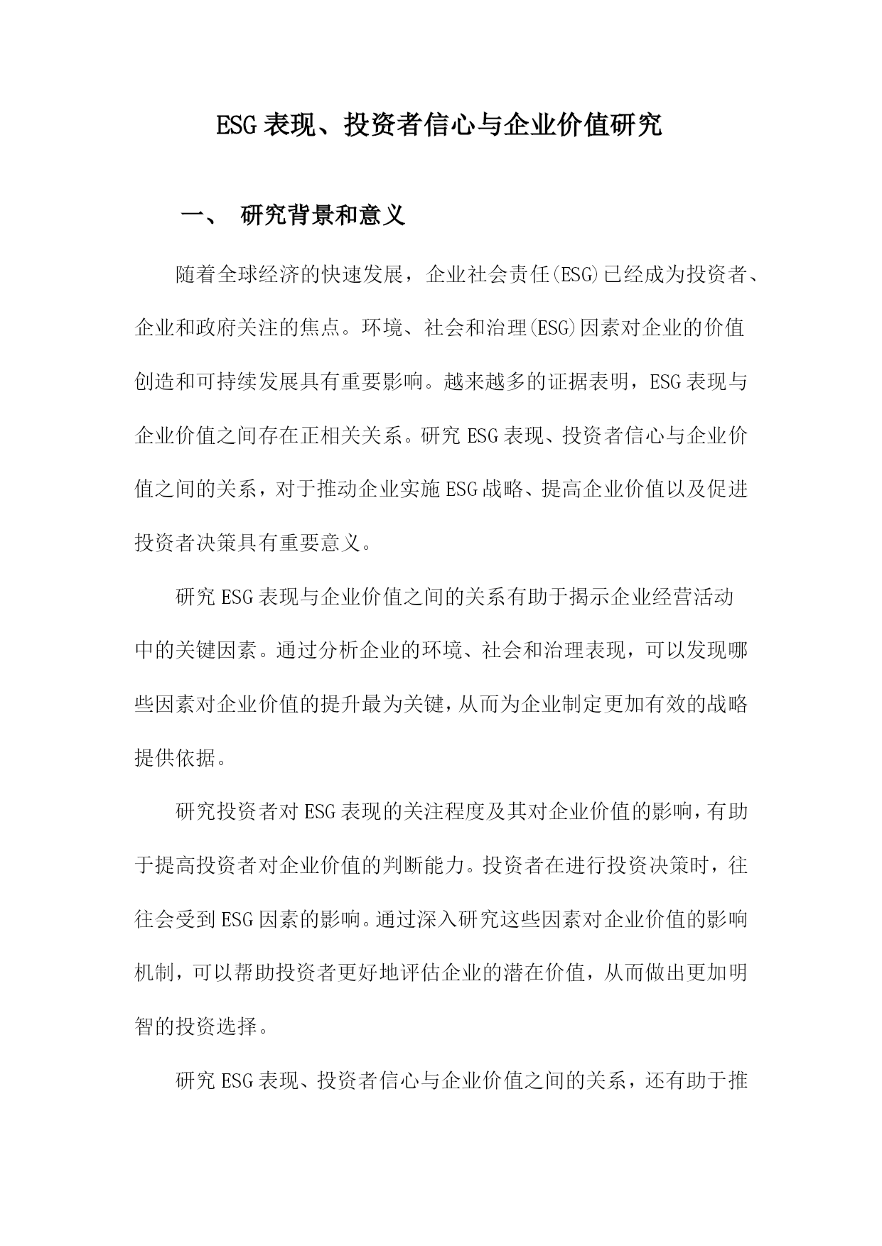 ESG表现、投资者信心与企业价值研究一、研究背景和意义随着全球经济的快速发展,企业社会责任(ESG)已经成为投资者、企业和政府关注的焦点。环境、社会和治理(ESG)因素对企业的价值创造和可持续发展具有重要影响。越来越多的证据表明,ESG表现与企业价值之间存在正相关关系。研究ESG表现、投资者信心与企业价值之间的关系,对于推动企业实施ESG战略、提高企业价值以及促进投资者决策具有重要意义。研究ESG表现与企业价值之间的关系有助于揭示企业经营活动中的关键因素。通过分析企业的环境、社会和治理表现,可以发现哪些因