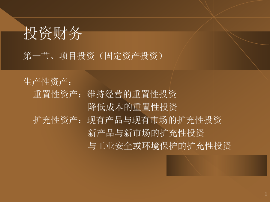 投资财务现金流量图投资财务投资财务三、现金流量怎么计算?1.用现金流量还是用利润来衡量业绩?资金(货币)的时间价值现金流量的计算资金(货币)的时间价值现金流量的计算投资财务投资财务投资财务7.贴现率(折现率)的确定投资财务四、投资项目的风险分析投资财务案例二:资本预算分析东风机械制造公司的资本预算根据上述的情况请回答下列问题:1.1993年所付的咨询费是否应在这项投资分析中加以考虑,为什么?2.到1998年末,5年贷款到期,在投资分析中是否要考虑到这年末的还款作为一项现金流出?为什么?每年的利息支出是否要
