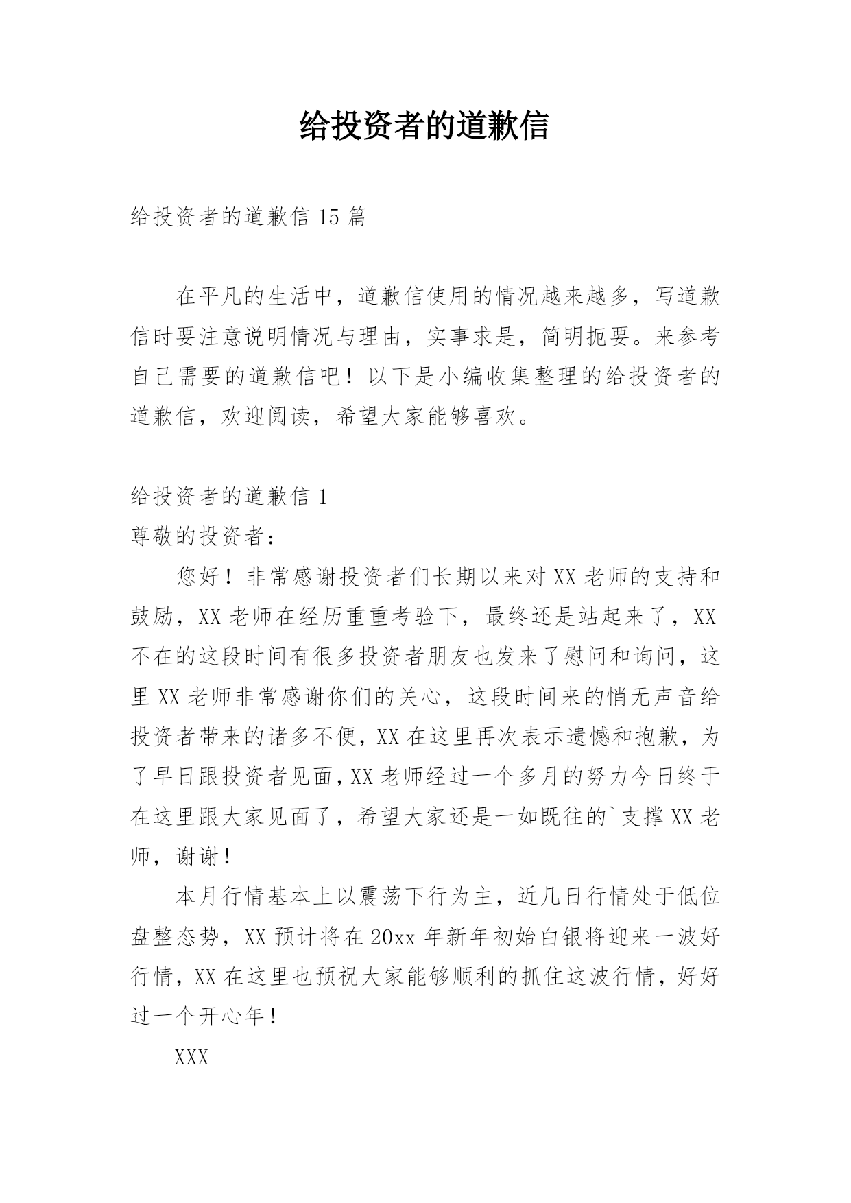 给投资者的道歉信给投资者的道歉信15篇在平凡的生活中,道歉信使用的情况越来越多,写道歉信时要注意说明情况与理由,实事求是,简明扼要。来参考自己需要的道歉信吧!以下是小编收集整理的给投资者的道歉信,欢迎阅读,希望大家能够喜欢。给投资者的道歉信1尊敬的投资者:您好!非常感谢投资者们长期以来对XX老师的支持和鼓励,XX老师在经历重重考验下,最终还是站起来了,XX不在的这段时间有很多投资者朋友也发来了慰问和询问,这里XX老师非常感谢你们的关心,这段时间来的悄无声音给投资者带来的诸多不便,XX在这里再次表示遗憾和抱