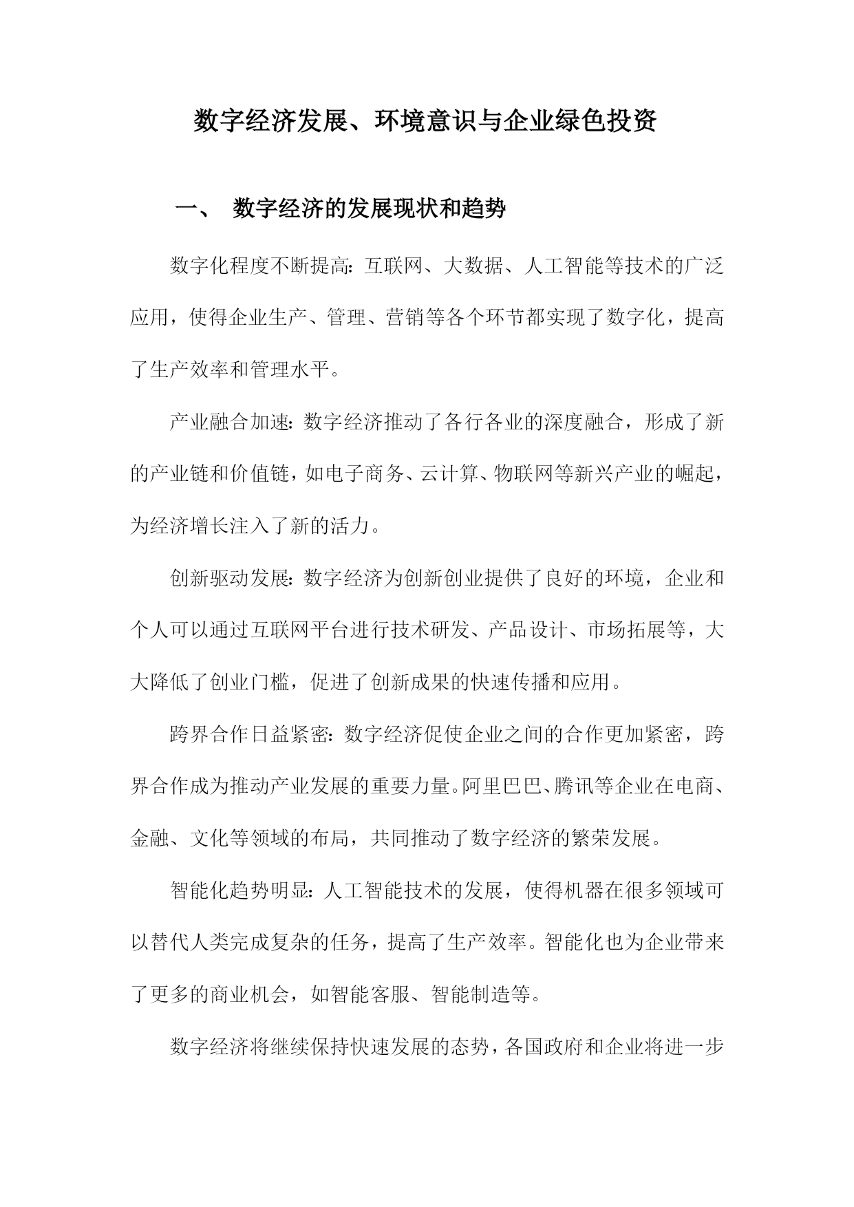 数字经济发展、环境意识与企业绿色投资一、数字经济的发展现状和趋势数字化程度不断提高:互联网、大数据、人工智能等技术的广泛应用,使得企业生产、管理、营销等各个环节都实现了数字化,提高了生产效率和管理水平。产业融合加速:数字经济推动了各行各业的深度融合,形成了新的产业链和价值链,如电子商务、云计算、物联网等新兴产业的崛起,为经济增长注入了新的活力。创新驱动发展:数字经济为创新创业提供了良好的环境,企业和个人可以通过互联网平台进行技术研发、产品设计、市场拓展等,大大降低了创业门槛,促进了创新成果的快速传播和应用
