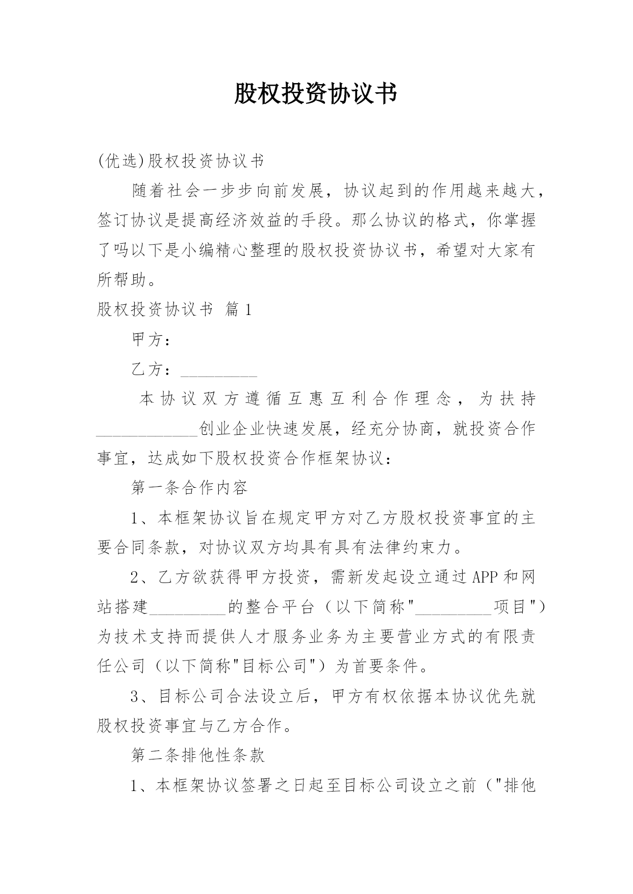 股权投资协议书(优选)股权投资协议书随着社会一步步向前发展,协议起到的作用越来越大,签订协议是提高经济效益的手段。那么协议的格式,你掌握了吗以下是小编精心整理的股权投资协议书,希望对大家有所帮助。股权投资协议书篇1甲方:乙方:_________本协议双方遵循互惠互利合作理念,为扶持____________创业企业快速发展,经充分协商,就投资合作事宜,达成如下股权投资合作框架协议:第一条合作内容1、本框架协议旨在规定甲方对乙方股权投资事宜的主要合同条款,对协议双方均具有具有法律约束力。2、乙方欲获得甲方投资