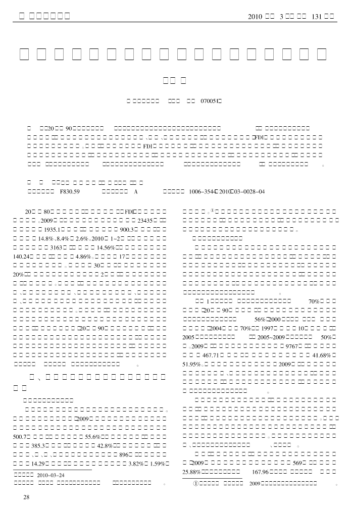 金融教学与研究2010年第3期(总第131期)我国利用外商直接投资存在的问题及对策毕海霞(河北金融学院,河北保定070051)摘要:20世纪90年代中后期以来,随着我国从整体性短缺经济向结构性过剩经济的转变,外商直接投资的负面效应开始显现,我国利用外商直接投资面临着产业、行业、区域结构失衡,核心技术含量不高,FDI利润汇回给国际收支带来潜在风险等新问题。因此,要提高我国利用FDI的质量和效果,需调整和改进利用外资的政策,均衡引导外商直接投资资金的流入与流出;注重培育自主创新能力,增强我国企业的国际竞争力;
