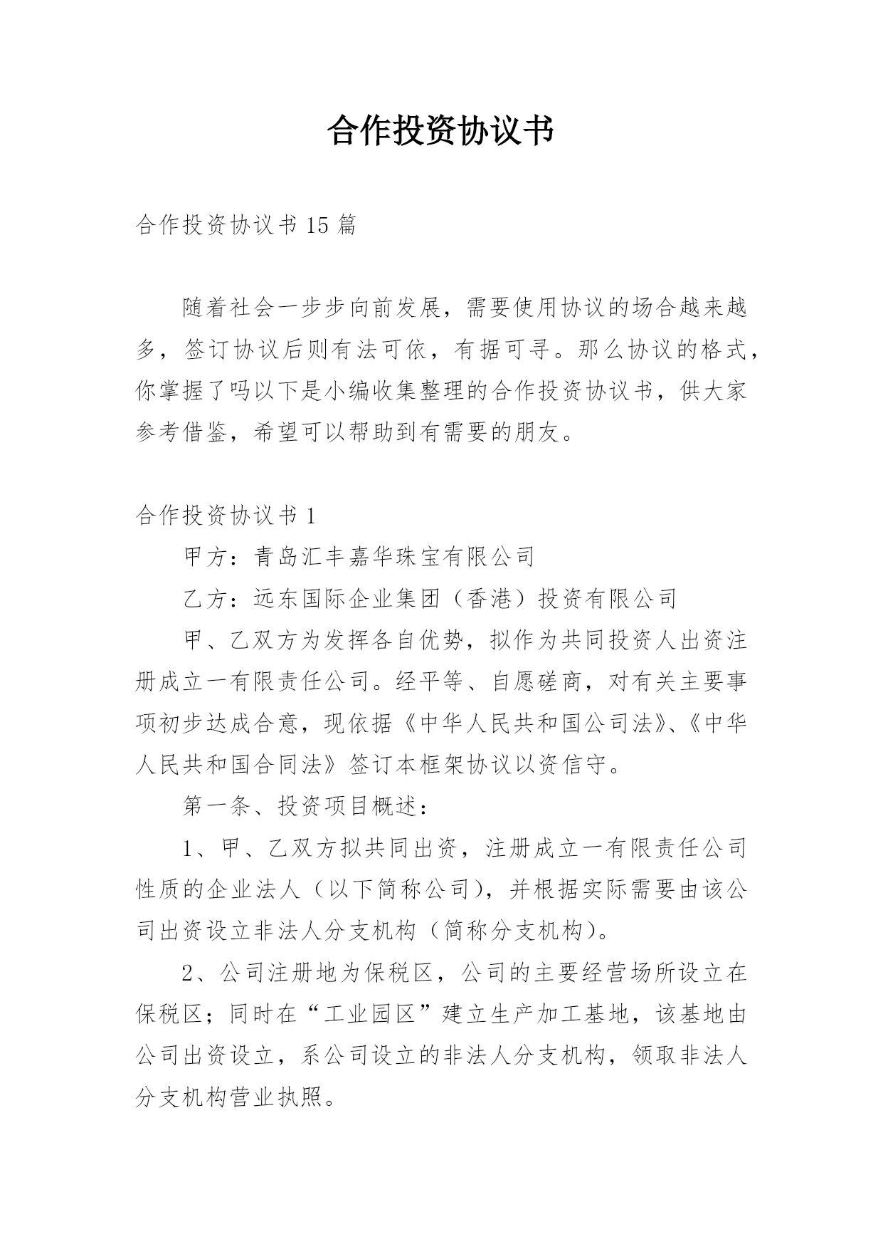 合作投资协议书合作投资协议书15篇随着社会一步步向前发展,需要使用协议的场合越来越多,签订协议后则有法可依,有据可寻。那么协议的格式,你掌握了吗以下是小编收集整理的合作投资协议书,供大家参考借鉴,希望可以帮助到有需要的朋友。合作投资协议书1甲方:青岛汇丰嘉华珠宝有限公司乙方:远东国际企业集团(香港)投资有限公司甲、乙双方为发挥各自优势,拟作为共同投资人出资注册成立一有限责任公司。经平等、自愿磋商,对有关主要事项初步达成合意,现依据《中华人民共和国公司法》、《中华人民共和国合同法》签订本框架协议以资信守。第