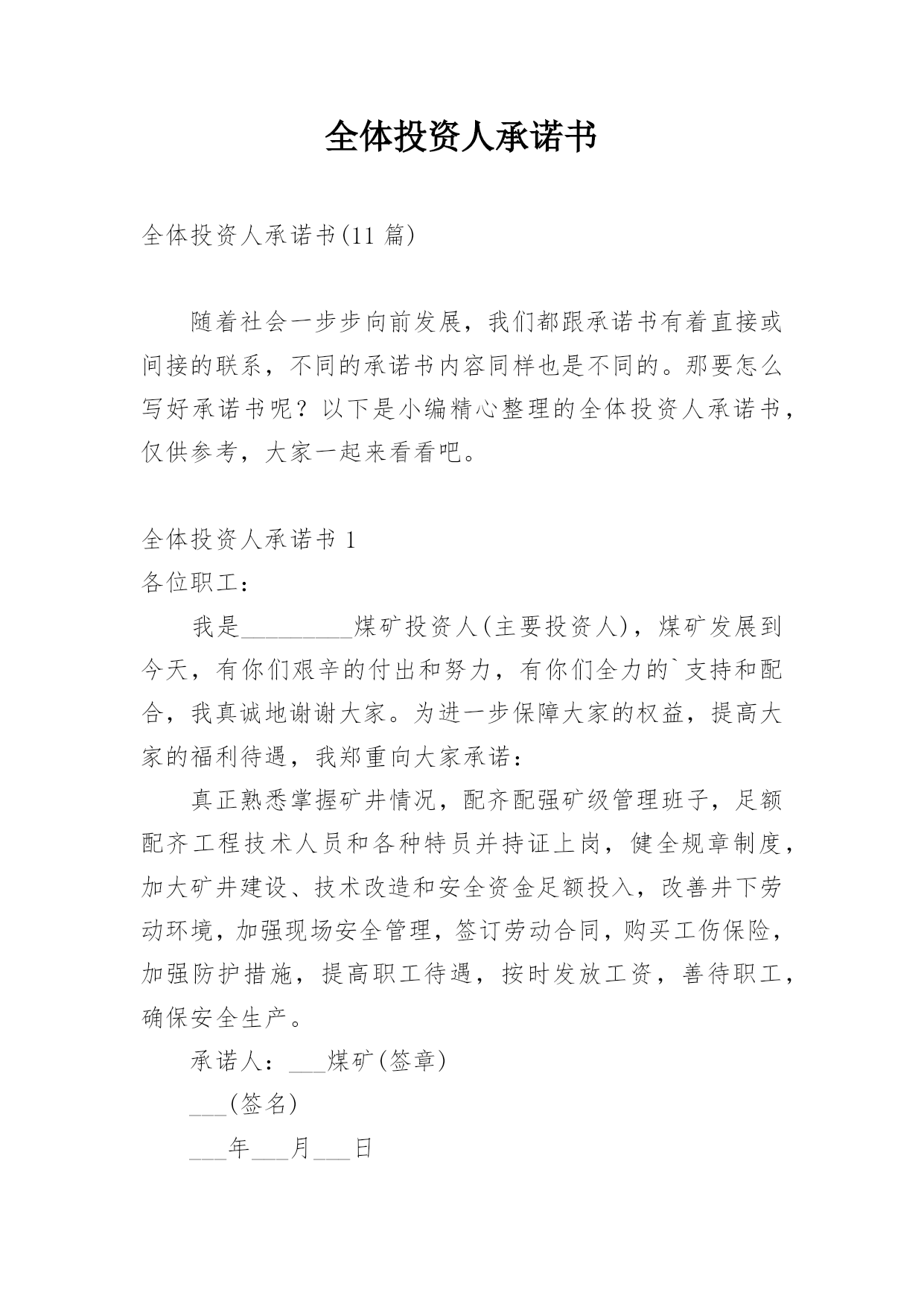 全体投资人承诺书全体投资人承诺书(11篇)随着社会一步步向前发展,我们都跟承诺书有着直接或间接的联系,不同的承诺书内容同样也是不同的。那要怎么写好承诺书呢?以下是小编精心整理的全体投资人承诺书,仅供参考,大家一起来看看吧。全体投资人承诺书1各位职工:我是_________煤矿投资人(主要投资人),煤矿发展到今天,有你们艰辛的付出和努力,有你们全力的`支持和配合,我真诚地谢谢大家。为进一步保障大家的权益,提高大家的福利待遇,我郑重向大家承诺:真正熟悉掌握矿井情况,配齐配强矿级管理班子,足额配齐工程技术人员和