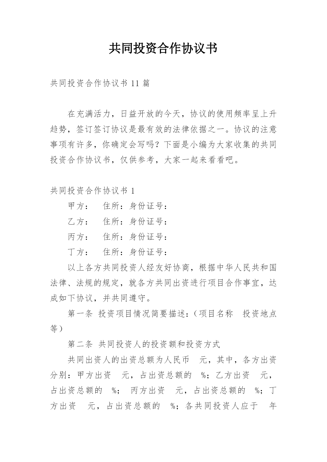 共同投资合作协议书共同投资合作协议书11篇在充满活力,日益开放的今天,协议的使用频率呈上升趋势,签订签订协议是最有效的法律依据之一。协议的注意事项有许多,你确定会写吗?下面是小编为大家收集的共同投资合作协议书,仅供参考,大家一起来看看吧。共同投资合作协议书1甲方:住所:身份证号:乙方:住所:身份证号:丙方:住所:身份证号:丁方:住所:身份证号:以上各方共同投资人经友好协商,根据中华人民共和国法律、法规的规定,就各方共同出资进行项目合作事宜,达成如下协议,并共同遵守。第一条投资项目情况简要描述:(项目名称投