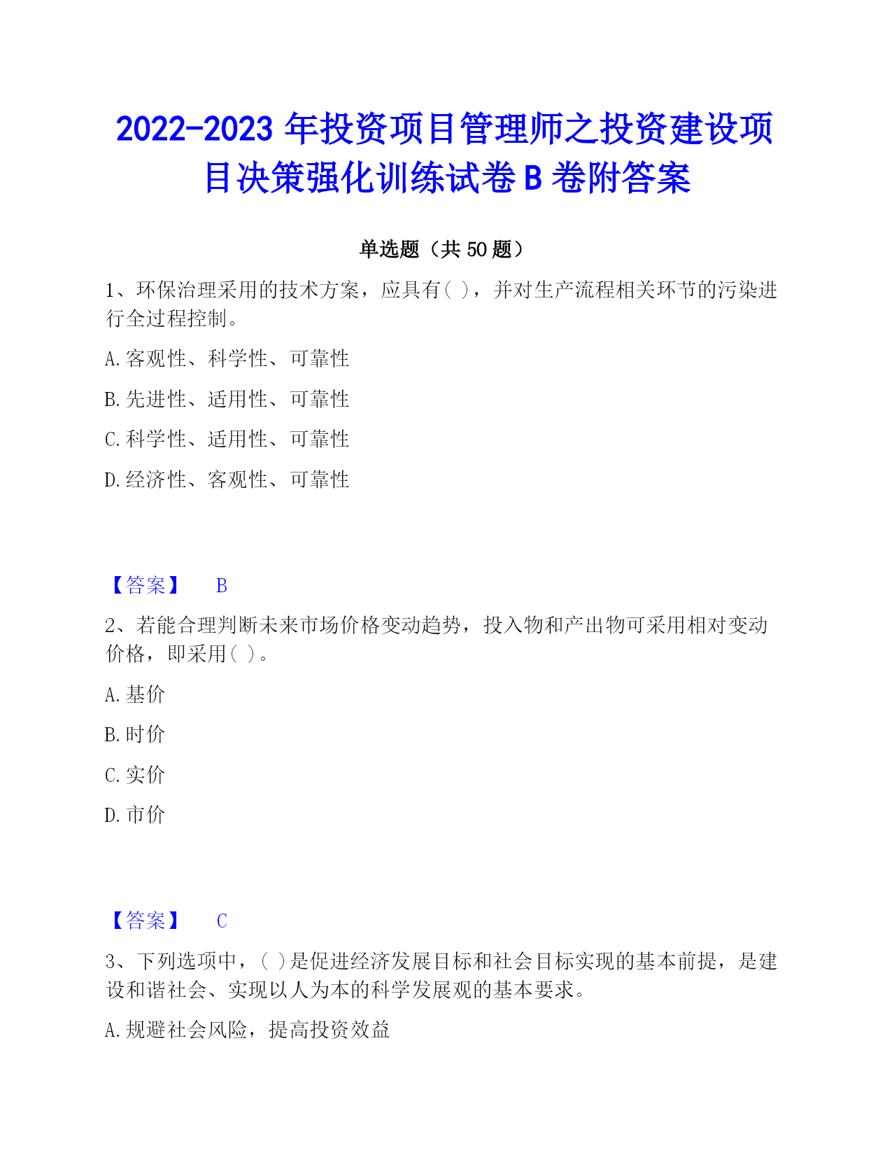 2022-2023年投资项目管理师之投资建设项目决策强化训练试卷B卷附答案单选题(共50题)1、环保治理采用的技术方案,应具有(),并对生产流程相关环节的污染进行全过程控制。A.客观性、科学性、可靠性B.先进性、适用性、可靠性C.科学性、适用性、可靠性D.经济性、客观性、可靠性【答案】B2、若能合理判断未来市场价格变动趋势,投入物和产出物可采用相对变动价格,即采用()。A.基价B.时价C.实价D.市价【答案】C3、下列选项中,()是促进经济发展目标和社会目标实现的基本前提,是建设和谐社会、实现以人为本的科