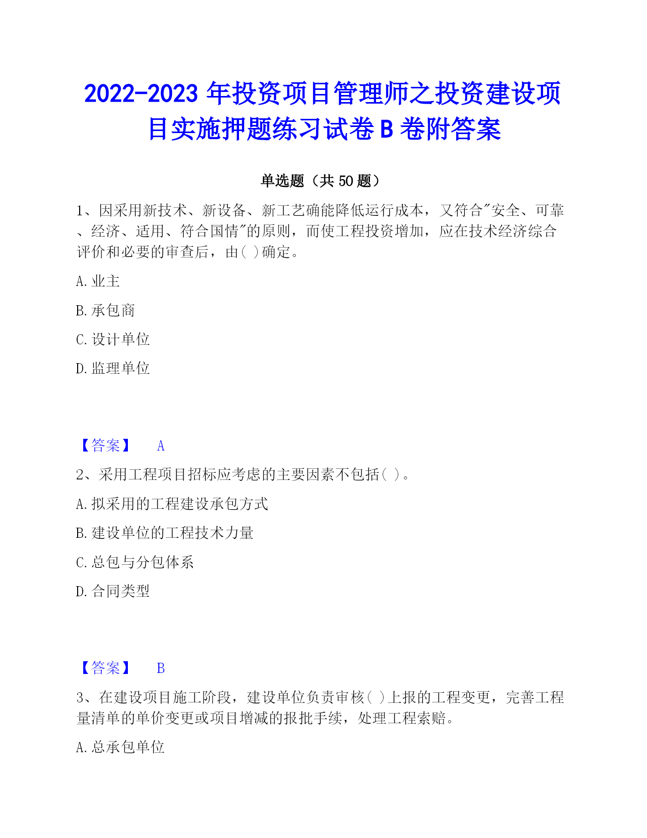 2022-2023年投资项目管理师之投资建设项目实施押题练习试卷B卷附答案单选题(共50题)1、因采用新技术、新设备、新工艺确能降低运行成本,又符合"安全、可靠、经济、适用、符合国情"的原则,而使工程投资增加,应在技术经济综合评价和必要的审查后,由()确定。A.业主B.承包商C.设计单位D.监理单位【答案】A2、采用工程项目招标应考虑的主要因素不包括()。A.拟采用的工程建设承包方式B.建设单位的工程技术力量C.总包与分包体系D.合同类型【答案】B3、在建设项目施工阶段,建设单位负责审核()上报的工程变更