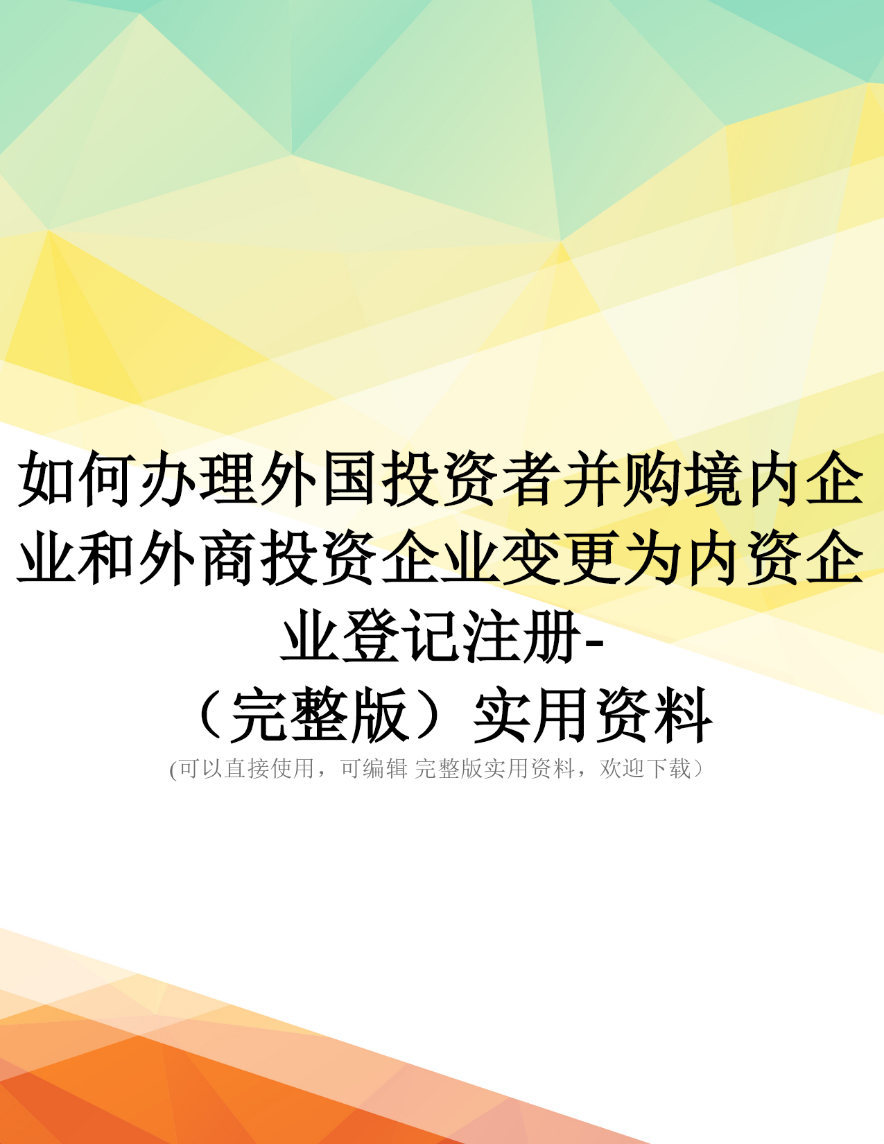 如何办理外国投资者并购境内企业和外商投资企业变更为内资企业登记注册-(完整版)实用资料(可以直接使用,可编辑完整版实用资料,欢迎下载)北京市工商行政管理局制⒀一次性告知单(2006年第三版如何办理外国投资者并购境内企业和外商投资企业变更为内资企业登记注册致申请人欢迎您到北京市工商行政管理机关办理登记注册,我们遵行“以申请人为本”的服务理念,承诺尽可能为您提供方便和帮助。为使您对办照过程、办照知识有一个基本了解,我们制作了《一次提请注意:本告知单所载内容属一般介绍性质,如有疑问,请查阅相关法律法规,也可以拨