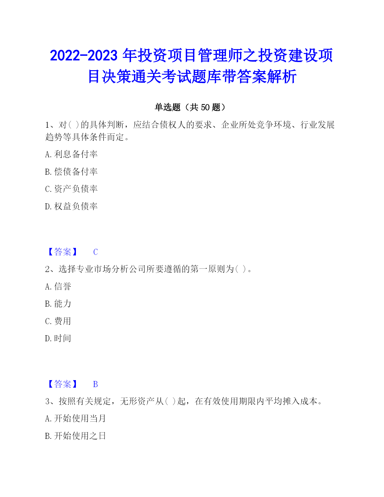 2022-2023年投资项目管理师之投资建设项目决策通关考试题库带答案解析.docx