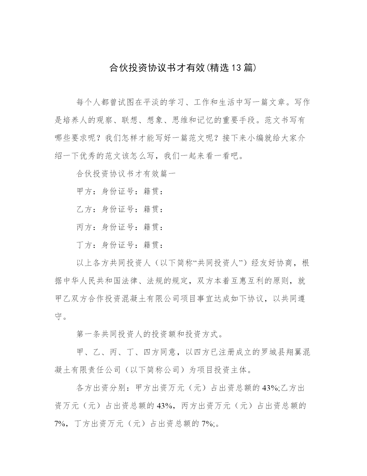 合伙投资协议书才有效(精选13篇)每个人都曾试图在平淡的学习、工作和生活中写一篇文章。写作是培养人的观察、联想、想象、思维和记忆的重要手段。范文书写有哪些要求呢?我们怎样才能写好一篇范文呢?接下来小编就给大家介绍一下优秀的范文该怎么写,我们一起来看一看吧。合伙投资协议书才有效篇一甲方:身份证号:籍贯:乙方:身份证号:籍贯:丙方:身份证号:籍贯:丁方:身份证号:籍贯:以上各方共同投资人(以下简称“共同投资人”)经友好协商,根据中华人民共和国法律、法规的规定,双方本着互惠互利的原则,就甲乙双方合作投资混凝土有
