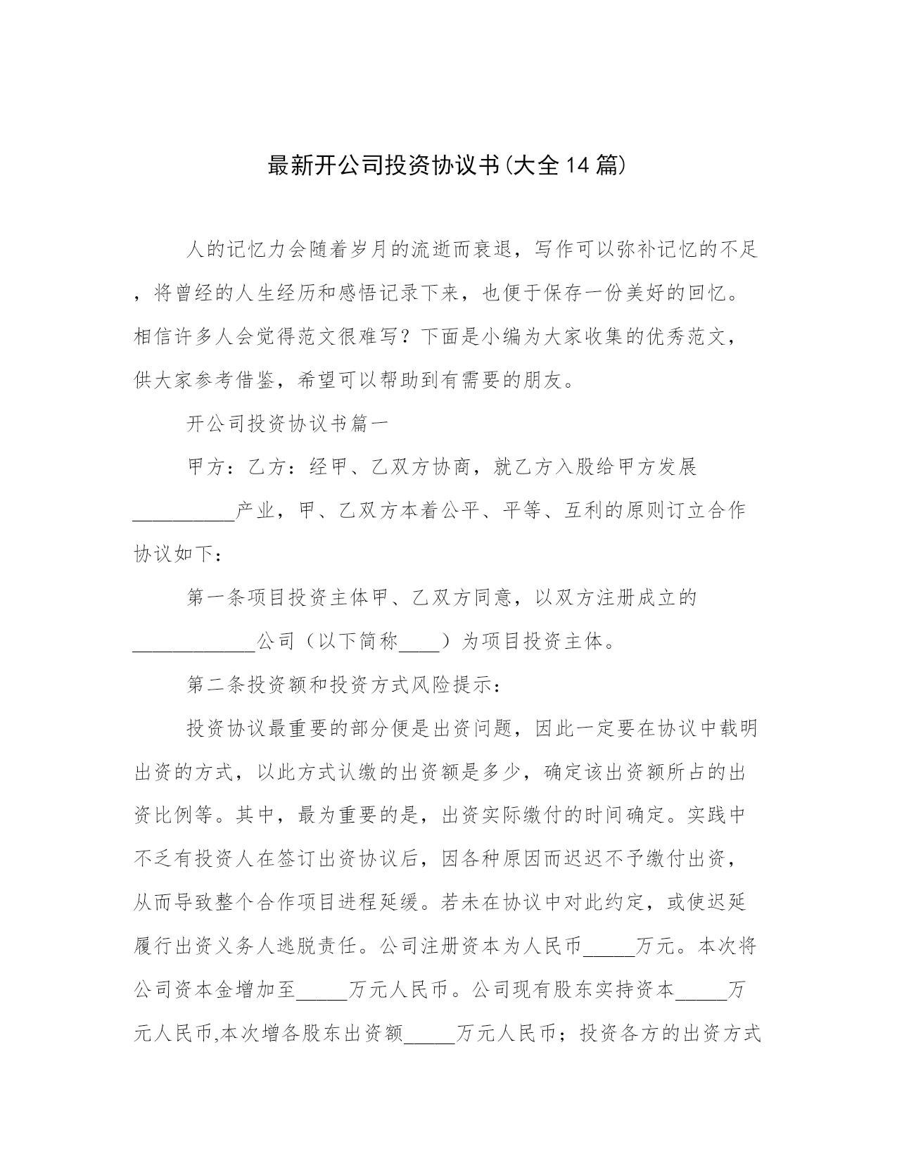 最新开公司投资协议书(大全14篇)人的记忆力会随着岁月的流逝而衰退,写作可以弥补记忆的不足,将曾经的人生经历和感悟记录下来,也便于保存一份美好的回忆。相信许多人会觉得范文很难写?下面是小编为大家收集的优秀范文,供大家参考借鉴,希望可以帮助到有需要的朋友。开公司投资协议书篇一甲方:乙方:经甲、乙双方协商,就乙方入股给甲方发展__________产业,甲、乙双方本着公平、平等、互利的原则订立合作协议如下:第一条项目投资主体甲、乙双方同意,以双方注册成立的____________公司(以下简称____)为项目投
