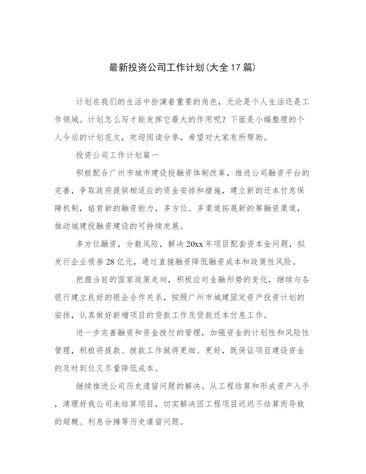 最新投资公司工作计划(大全17篇)计划在我们的生活中扮演着重要的角色,无论是个人生活还是工作领域。计划怎么写才能发挥它最大的作用呢?下面是小编整理的个人今后的计划范文,欢迎阅读分享,希望对大家有所帮助。投资公司工作计划篇一积极配合广州市城市建设投融资体制改革,推进公司融资平台的完善,争取政府提供相适应的资金安排和措施,建立新的还本付息保障机制,培育新的融资能力,多方位、多渠道拓展新的筹融资渠道,推动城建投融资建设的可持续发展。多方位融资,分散风险,解决20xx年项目配套资本金问题,拟发行企业债券28亿元,