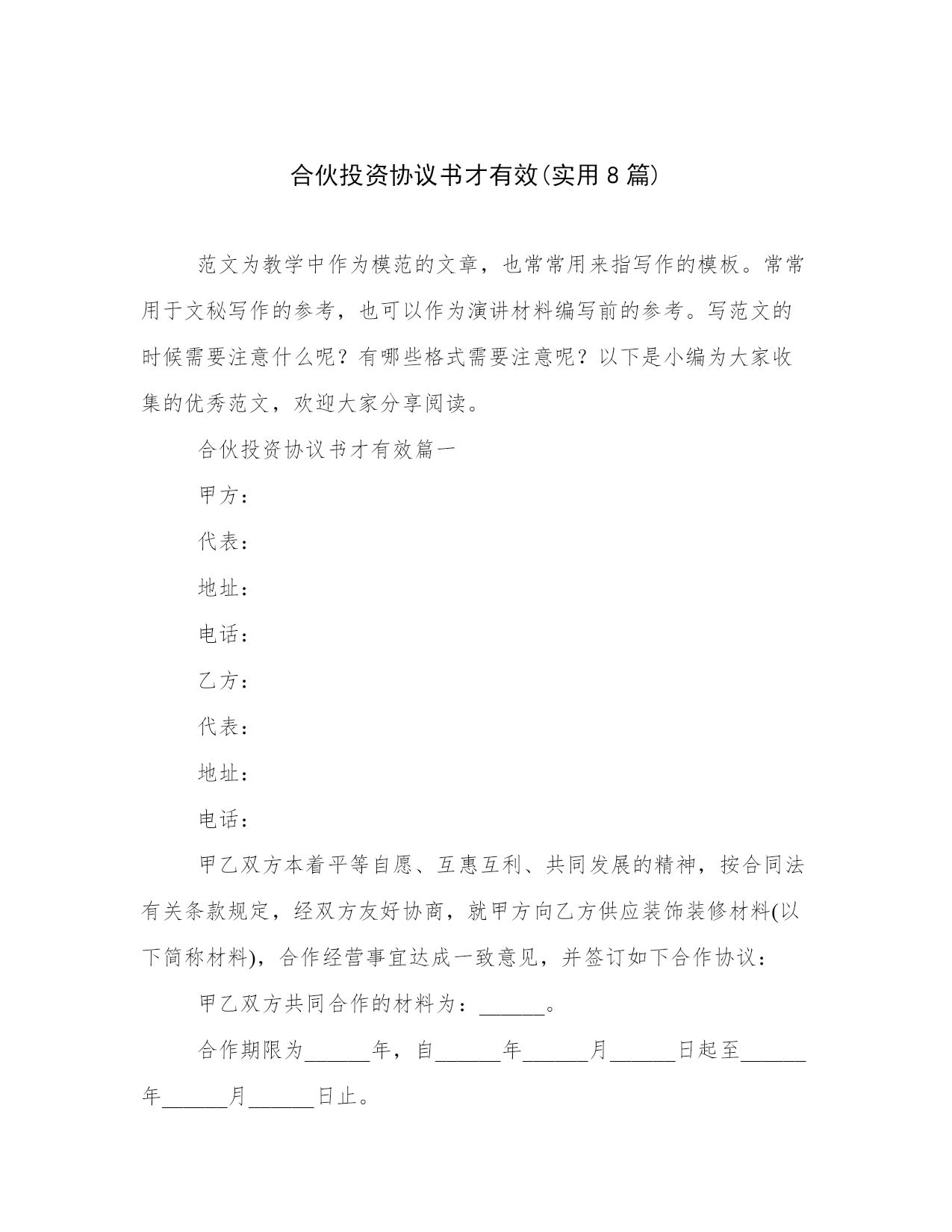 合伙投资协议书才有效(实用8篇)范文为教学中作为模范的文章,也常常用来指写作的模板。常常用于文秘写作的参考,也可以作为演讲材料编写前的参考。写范文的时候需要注意什么呢?有哪些格式需要注意呢?以下是小编为大家收集的优秀范文,欢迎大家分享阅读。合伙投资协议书才有效篇一甲方:代表:地址:电话:乙方:代表:地址:电话:甲乙双方本着平等自愿、互惠互利、共同发展的精神,按合同法有关条款规定,经双方友好协商,就甲方向乙方供应装饰装修材料(以下简称材料),合作经营事宜达成一致意见,并签订如下合作协议:甲乙双方共同合作的材