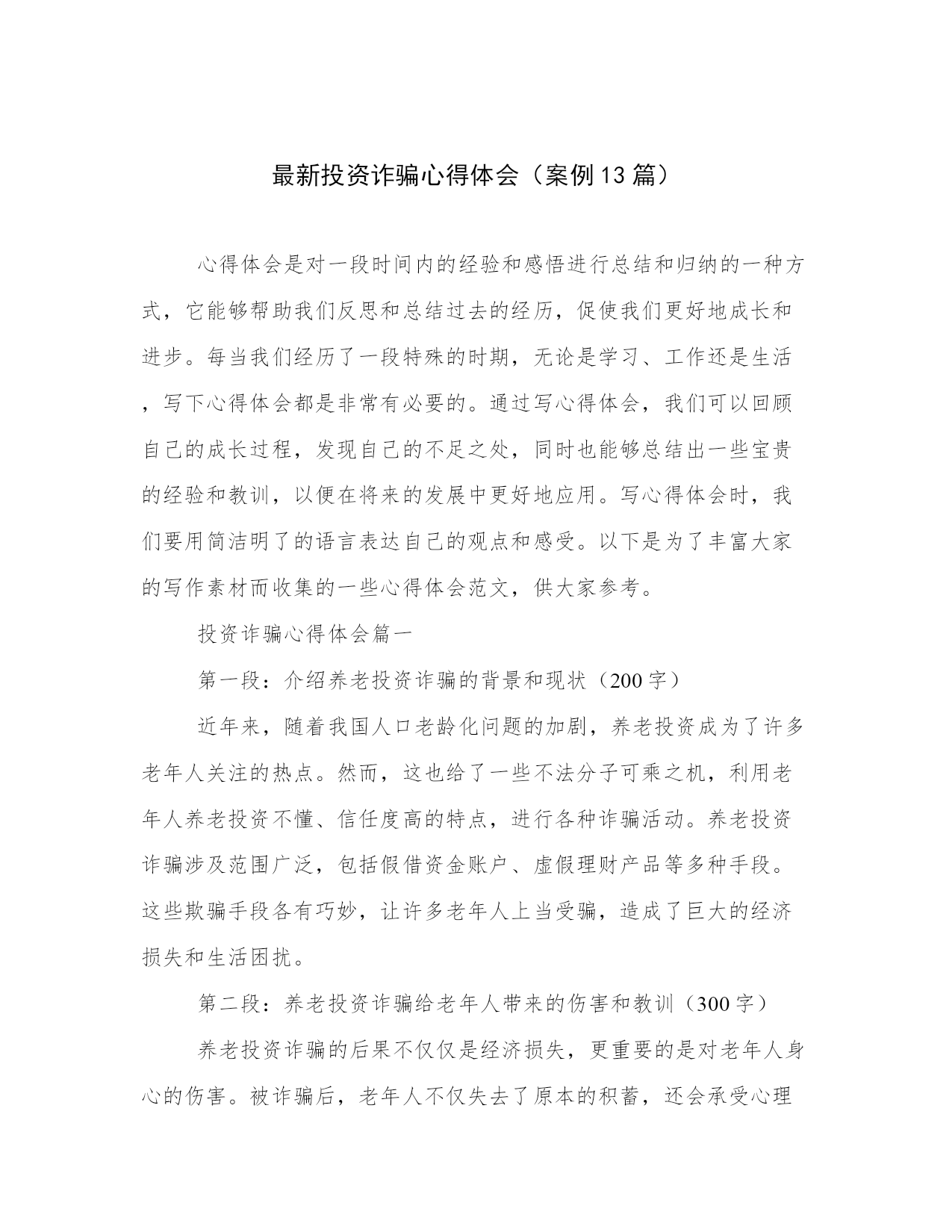 最新投资诈骗心得体会(案例13篇)心得体会是对一段时间内的经验和感悟进行总结和归纳的一种方式,它能够帮助我们反思和总结过去的经历,促使我们更好地成长和进步。每当我们经历了一段特殊的时期,无论是学习、工作还是生活,写下心得体会都是非常有必要的。通过写心得体会,我们可以回顾自己的成长过程,发现自己的不足之处,同时也能够总结出一些宝贵的经验和教训,以便在将来的发展中更好地应用。写心得体会时,我们要用简洁明了的语言表达自己的观点和感受。以下是为了丰富大家的写作素材而收集的一些心得体会范文,供大家参考。投资诈骗心得