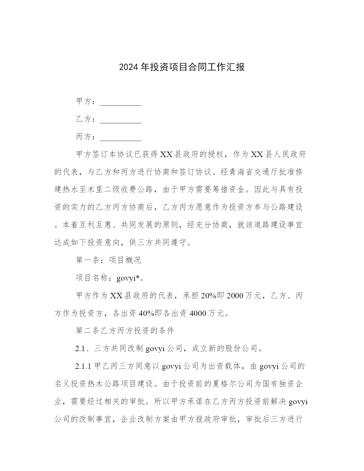 2024年投资项目合同工作汇报甲方:__________乙方:__________丙方:__________甲方签订本协议已获得XX县政府的授权,作为XX县人民政府的代表,与乙方和丙方进行协商和签订协议。经青海省交通厅批准修建热水至木里二级收费公路,由于甲方需要筹措资金。因此与具有投资的实力的乙方丙方协商后,乙方丙方愿意作为投资方参与公路建设。本着互利互惠、共同发展的原则,经充分协商,就该道路建设事宜达成如下投资意向,供三方共同遵守。第一条:项目概况项目名称:govyi*。甲方作为XX县政府的代表,承担2