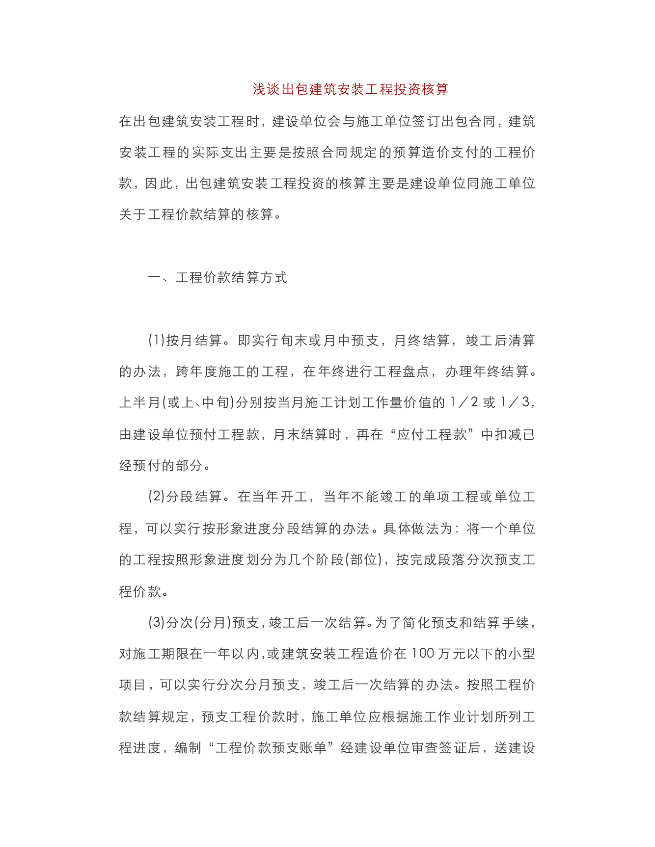 浅谈出包建筑安装工程投资核算在出包建筑安装工程时建设单位会与施工单位签订出包合同建筑安装工程的实际支出主要是按照合同规定的预算造价支付的工程价款因此出包建筑安装工程投资的核算主要是建设单位同施工单位关于工程价款结算的核算。一、工程价款结算方式(1)按月结算。即实行旬末或月中预支月终结算竣工后清算的办法跨年度施工的工程在年终进行工程盘点办理年终结算。上半月(或上、中旬)分别按当月施工计划工作量价值的12或13由建设单位预付工程款月末结算时再在“应付工程款”中扣减已经预付的部分。(