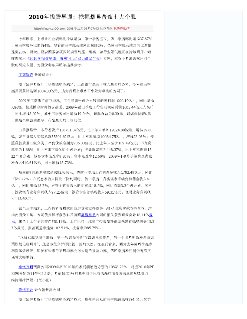2010年投资早课:挖掘最具价值七大个股http://finance.QQ.com2009年11月06日07:43证券日报我要评论(7)今年以来,上市公司业绩环比持续增长,第一季度扭亏,第二季度环比增长37.67%,第三季度环比增长4%。尽管前三季度业绩同比微降2%,但第三季度业绩却同比增幅达到26%,反映出随着国家各项振兴规划的逐一落实,各行业景气度正在持续回升。继昨日推出《2010年投资早课:看清“七大”动力最劲行业》专题,本报今日继续推出对个股的研究专题,为投资者布局明年提供参考。工商银行最赚钱公司