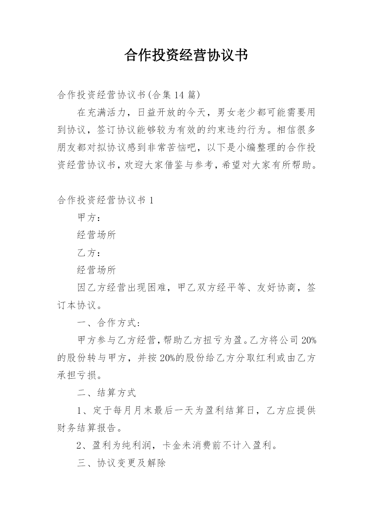 合作投资经营协议书合作投资经营协议书(合集14篇)在充满活力,日益开放的今天,男女老少都可能需要用到协议,签订协议能够较为有效的约束违约行为。相信很多朋友都对拟协议感到非常苦恼吧,以下是小编整理的合作投资经营协议书,欢迎大家借鉴与参考,希望对大家有所帮助。合作投资经营协议书1甲方:经营场所乙方:经营场所因乙方经营出现困难,甲乙双方经平等、友好协商,签订本协议。一、合作方式:甲方参与乙方经营,帮助乙方扭亏为盈。乙方将公司20%的股份转与甲方,并按20%的股份给乙方分取红利或由乙方承担亏损。二、结算方式1、定