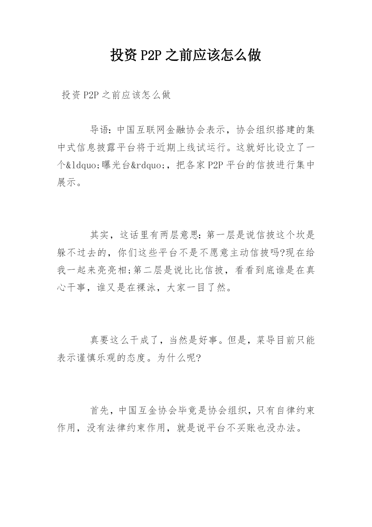 投资P2P之前应该怎么做投资P2P之前应该怎么做导语:中国互联网金融协会表示,协会组织搭建的集中式信息披露平台将于近期上线试运行。这就好比设立了一个“曝光台”,把各家P2P平台的信披进行集中展示。其实,这话里有两层意思:第一层是说信披这个坎是躲不过去的,你们这些平台不是不愿意主动信披吗?现在给我一起来亮亮相;第二层是说比比信披,看看到底谁是在真心干事,谁又是在裸泳,大家一目了然。真要这么干成了,当然是好事。但是,菜导目前只能表示谨慎乐观的态度。为什么呢?首先,中国互金协会毕竟是协会