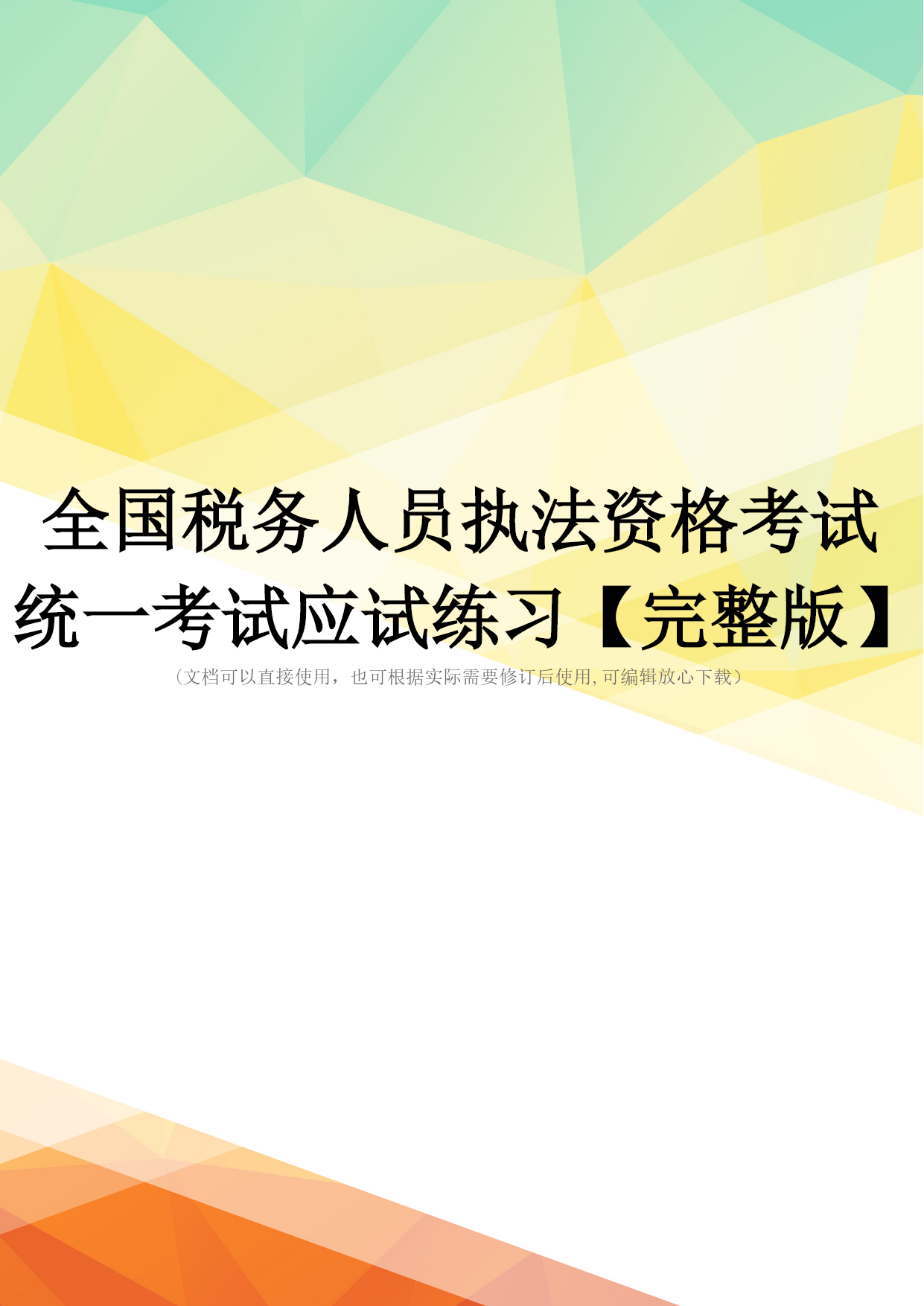 全国税务人员执法资格考试统一考试应试练习【完整版】(文档可以直接使用,也可根据实际需要修订后使用,可编辑放心下载)全国税务人员执法资格考试统一考试应试练习第一章法学根底一、单项选择题1.法与其他社会标准不同,法是由(D)制定或认可的。A.法院B.国家机关C.社会团体D.国家2.法是某种社会集团意志的表达,这种意志必须是(C)。A.国民意志B.共同意志C.国家意志D.人民意志3.法是依靠(D)保证实施的。A.暴力B.法院C.自觉D.国家强制力4.法作为一种社会现象,具有丰富的内容,其核心内容是(D)。A.自