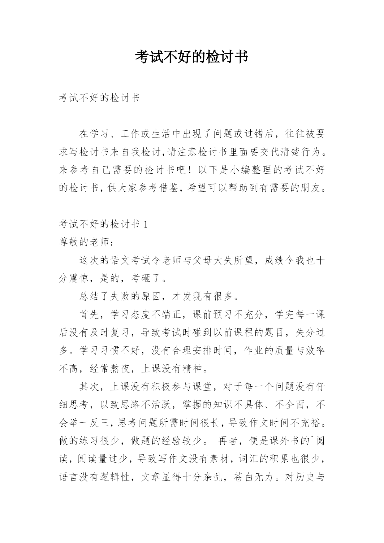 考试不好的检讨书考试不好的检讨书在学习、工作或生活中出现了问题或过错后,往往被要求写检讨书来自我检讨,请注意检讨书里面要交代清楚行为。来参考自己需要的检讨书吧!以下是小编整理的考试不好的检讨书,供大家参考借鉴,希望可以帮助到有需要的朋友。考试不好的检讨书1尊敬的老师:这次的语文考试令老师与父母大失所望,成绩令我也十分震惊,是的,考砸了。总结了失败的原因,才发现有很多。首先,学习态度不端正,课前预习不充分,学完每一课后没有及时复习,导致考试时碰到以前课程的题目,失分过多。学习习惯不好,没有合理安排时间,作业