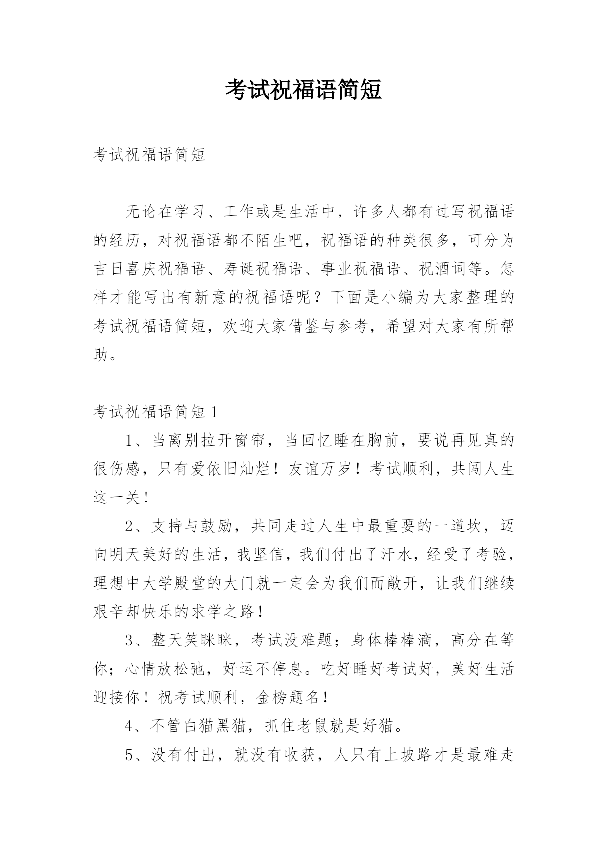 考试祝福语简短考试祝福语简短无论在学习、工作或是生活中,许多人都有过写祝福语的经历,对祝福语都不陌生吧,祝福语的种类很多,可分为吉日喜庆祝福语、寿诞祝福语、事业祝福语、祝酒词等。怎样才能写出有新意的祝福语呢?下面是小编为大家整理的考试祝福语简短,欢迎大家借鉴与参考,希望对大家有所帮助。考试祝福语简短11、当离别拉开窗帘,当回忆睡在胸前,要说再见真的很伤感,只有爱依旧灿烂!友谊万岁!考试顺利,共闯人生这一关!2、支持与鼓励,共同走过人生中最重要的一道坎,迈向明天美好的生活,我坚信,我们付出了汗水,经受了考验