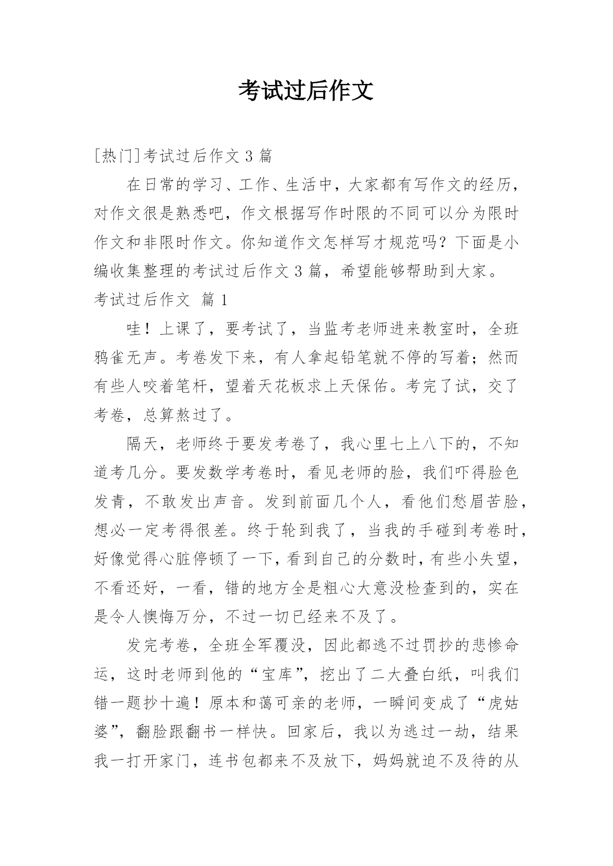 考试过后作文[热门]考试过后作文3篇在日常的学习、工作、生活中,大家都有写作文的经历,对作文很是熟悉吧,作文根据写作时限的不同可以分为限时作文和非限时作文。你知道作文怎样写才规范吗?下面是小编收集整理的考试过后作文3篇,希望能够帮助到大家。考试过后作文篇1哇!上课了,要考试了,当监考老师进来教室时,全班鸦雀无声。考卷发下来,有人拿起铅笔就不停的写着;然而有些人咬着笔杆,望着天花板求上天保佑。考完了试,交了考卷,总算熬过了。隔天,老师终于要发考卷了,我心里七上八下的,不知道考几分。要发数学考卷时,看见老师的
