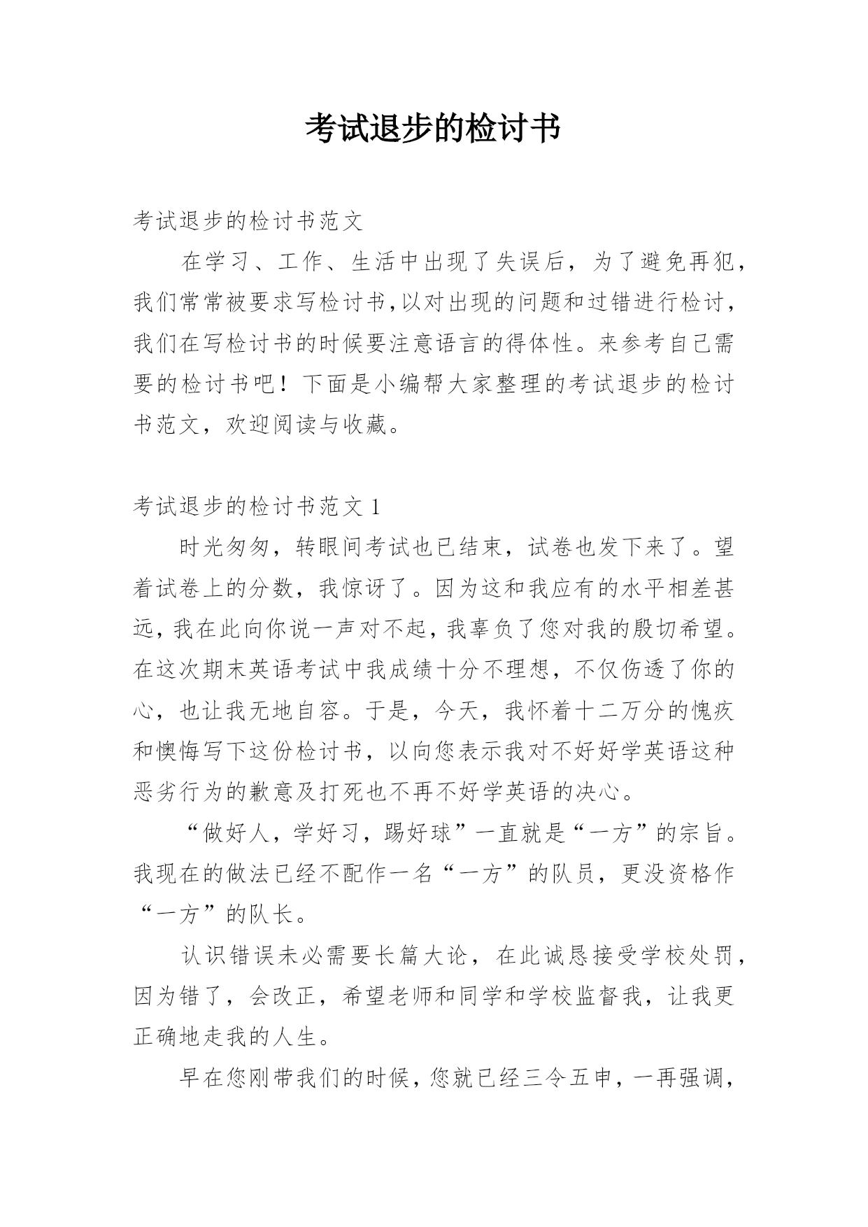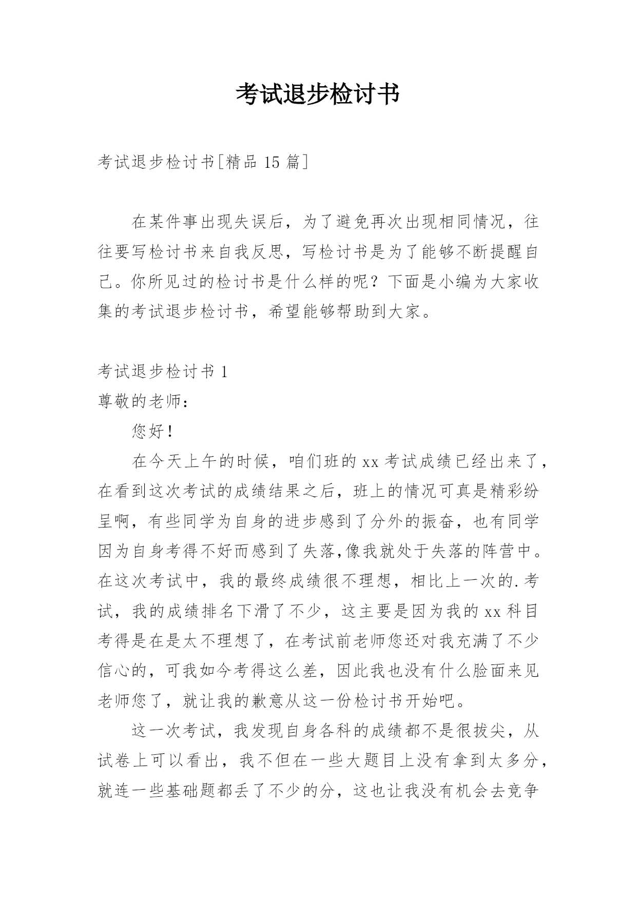 考试退步的检讨书考试退步的检讨书范文在学习、工作、生活中出现了失误后,为了避免再犯,我们常常被要求写检讨书,以对出现的问题和过错进行检讨,我们在写检讨书的时候要注意语言的得体性。来参考自己需要的检讨书吧!下面是小编帮大家整理的考试退步的检讨书范文,欢迎阅读与收藏。考试退步的检讨书范文1时光匆匆,转眼间考试也已结束,试卷也发下来了。望着试卷上的分数,我惊讶了。因为这和我应有的水平相差甚远,我在此向你说一声对不起,我辜负了您对我的殷切希望。在这次期末英语考试中我成绩十分不理想,不仅伤透了你的心,也让我无地自容
