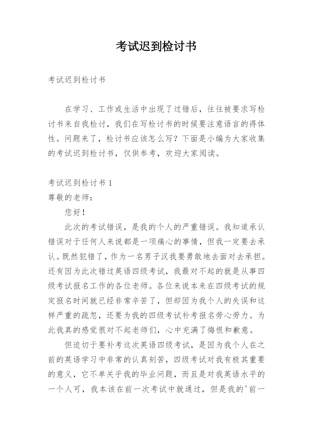 考试迟到检讨书考试迟到检讨书在学习、工作或生活中出现了过错后,往往被要求写检讨书来自我检讨,我们在写检讨书的时候要注意语言的得体性。问题来了,检讨书应该怎么写?下面是小编为大家收集的考试迟到检讨书,仅供参考,欢迎大家阅读。考试迟到检讨书1尊敬的老师:您好!此次的考试错误,是我的个人的严重错误。我知道承认错误对于任何人来说都是一项痛心的事情,但我一定要去承认。既然犯错了,作为一名男子汉我要勇敢地去面对去承担。还有因为此次错过英语四级考试,我最对不起的就是从事四级考试报名工作的各位老师。各位来说本来在四级考试