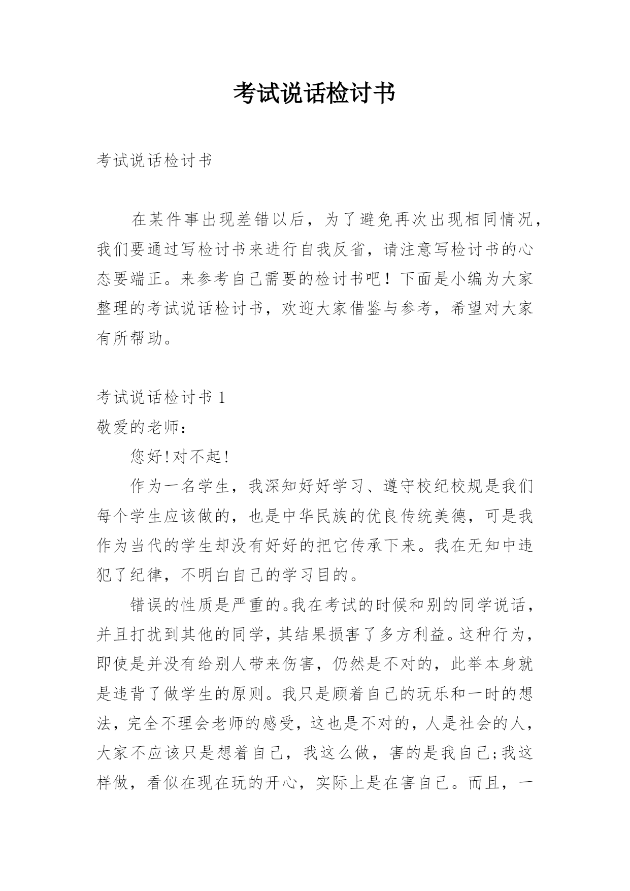 考试说话检讨书考试说话检讨书在某件事出现差错以后,为了避免再次出现相同情况,我们要通过写检讨书来进行自我反省,请注意写检讨书的心态要端正。来参考自己需要的检讨书吧!下面是小编为大家整理的考试说话检讨书,欢迎大家借鉴与参考,希望对大家有所帮助。考试说话检讨书1敬爱的老师:您好!对不起!作为一名学生,我深知好好学习、遵守校纪校规是我们每个学生应该做的,也是中华民族的优良传统美德,可是我作为当代的学生却没有好好的把它传承下来。我在无知中违犯了纪律,不明白自己的学习目的。错误的性质是严重的。我在考试的时候和别的同