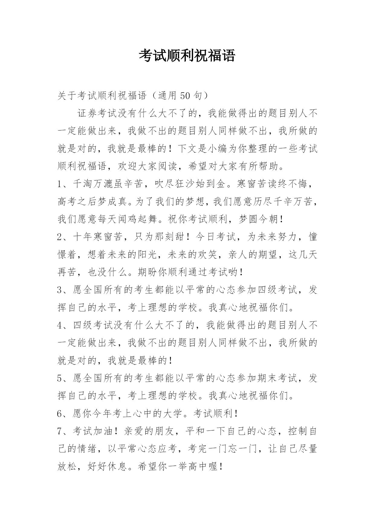 考试顺利祝福语关于考试顺利祝福语(通用50句)证券考试没有什么大不了的,我能做得出的题目别人不一定能做出来,我做不出的题目别人同样做不出,我所做的就是对的,我就是最棒的!下文是小编为你整理的一些考试顺利祝福语,欢迎大家阅读,希望对大家有所帮助。1、千淘万漉虽辛苦,吹尽狂沙始到金。寒窗苦读终不悔,高考之后梦成真。为了我们的梦想,我们愿意历尽千辛万苦,我们愿意每天闻鸡起舞。祝你考试顺利,梦圆今朝!2、十年寒窗苦,只为那刻甜!今日考试,为未来努力,憧憬着,想着未来的阳光,未来的欢笑,亲人的期望,这几天再苦,也没