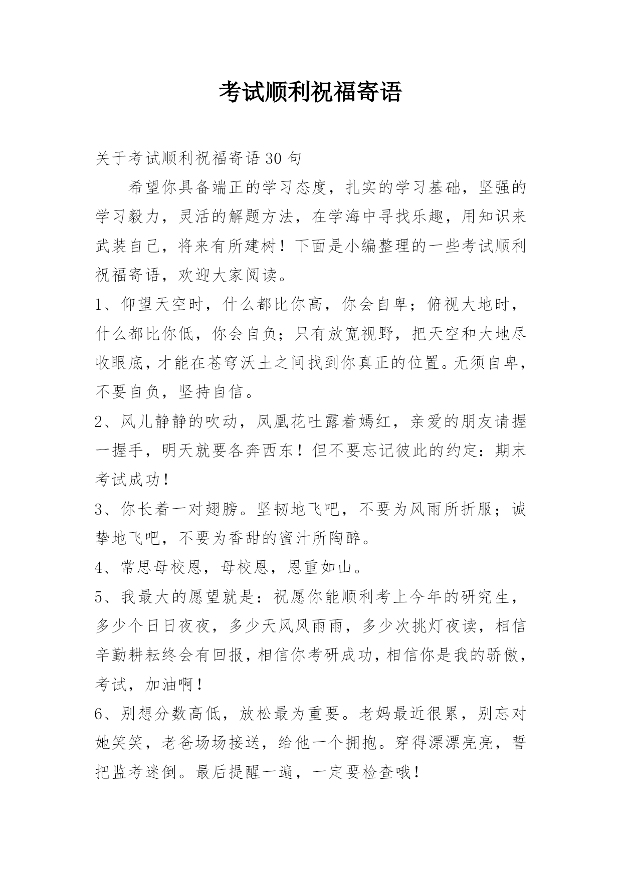 考试顺利祝福寄语关于考试顺利祝福寄语30句希望你具备端正的学习态度,扎实的学习基础,坚强的学习毅力,灵活的解题方法,在学海中寻找乐趣,用知识来武装自己,将来有所建树!下面是小编整理的一些考试顺利祝福寄语,欢迎大家阅读。1、仰望天空时,什么都比你高,你会自卑;俯视大地时,什么都比你低,你会自负;只有放宽视野,把天空和大地尽收眼底,才能在苍穹沃土之间找到你真正的位置。无须自卑,不要自负,坚持自信。2、风儿静静的吹动,凤凰花吐露着嫣红,亲爱的朋友请握一握手,明天就要各奔西东!但不要忘记彼此的约定:期末考试成功!