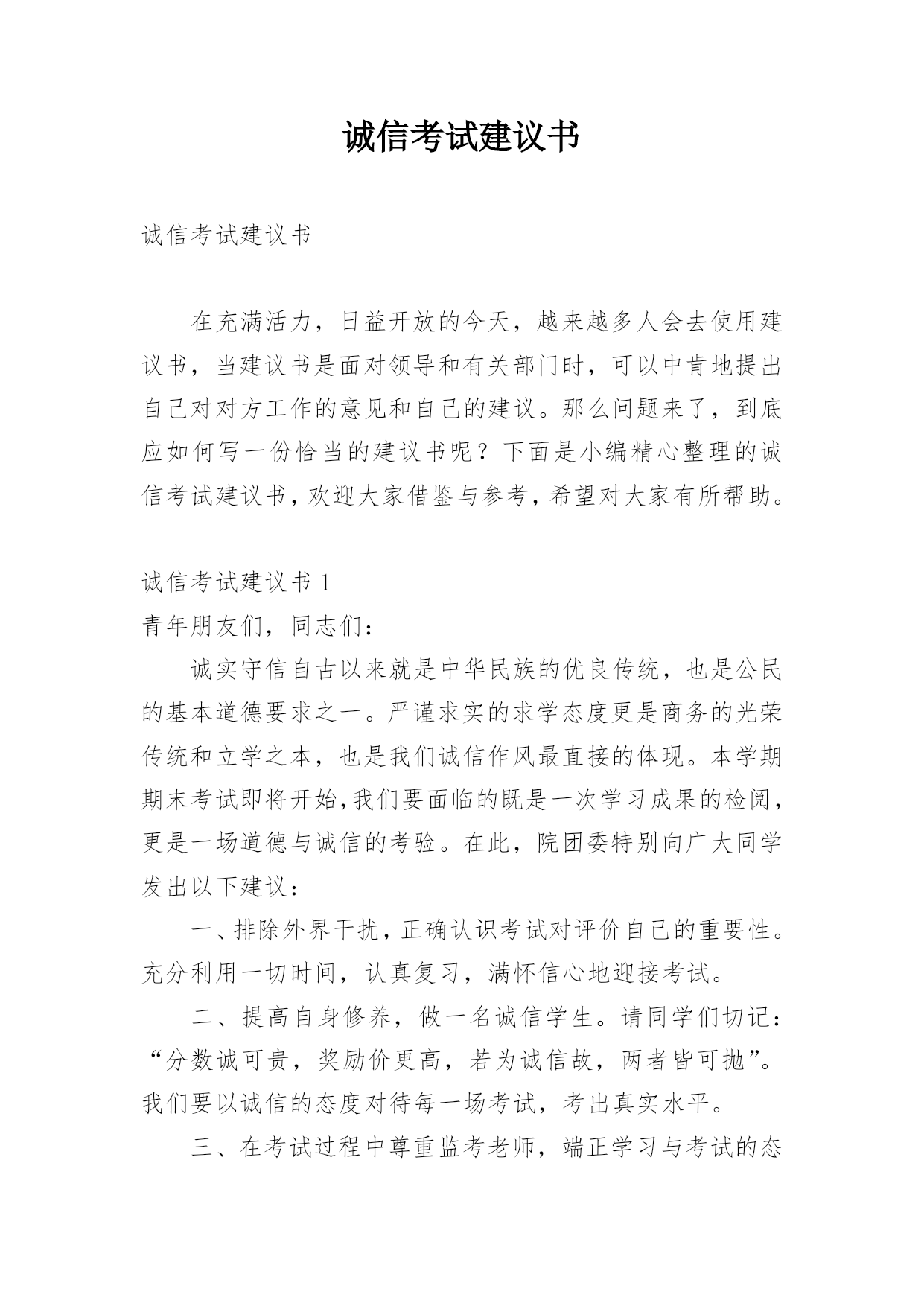 诚信考试建议书诚信考试建议书在充满活力,日益开放的今天,越来越多人会去使用建议书,当建议书是面对领导和有关部门时,可以中肯地提出自己对对方工作的意见和自己的建议。那么问题来了,到底应如何写一份恰当的建议书呢?下面是小编精心整理的诚信考试建议书,欢迎大家借鉴与参考,希望对大家有所帮助。诚信考试建议书1青年朋友们,同志们:诚实守信自古以来就是中华民族的优良传统,也是公民的基本道德要求之一。严谨求实的求学态度更是商务的光荣传统和立学之本,也是我们诚信作风最直接的体现。本学期期末考试即将开始,我们要面临的既是一次