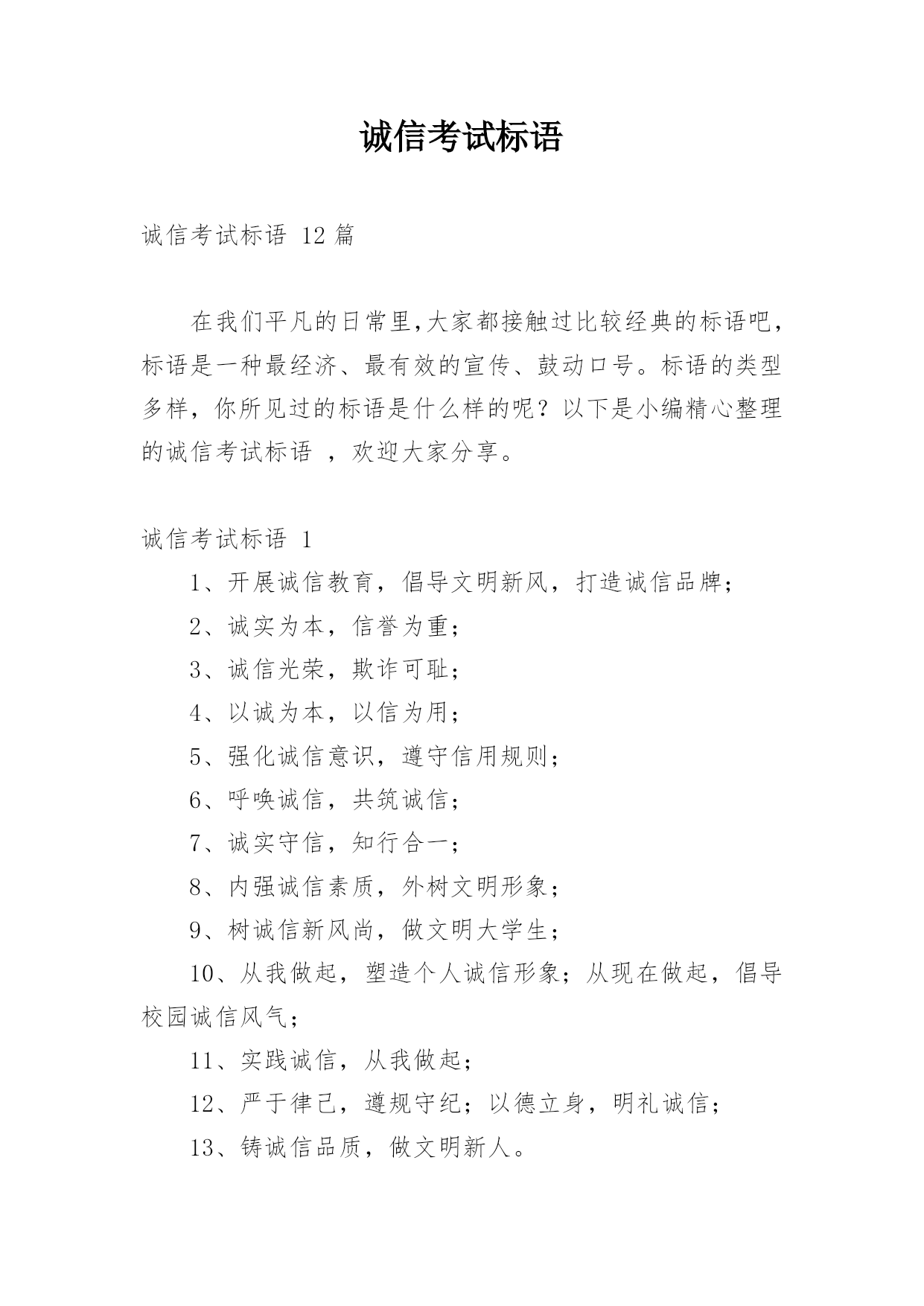诚信考试标语诚信考试标语12篇在我们平凡的日常里,大家都接触过比较经典的标语吧,标语是一种最经济、最有效的宣传、鼓动口号。标语的类型多样,你所见过的标语是什么样的呢?以下是小编精心整理的诚信考试标语,欢迎大家分享。诚信考试标语11、开展诚信教育,倡导文明新风,打造诚信品牌;2、诚实为本,信誉为重;3、诚信光荣,欺诈可耻;4、以诚为本,以信为用;5、强化诚信意识,遵守信用规则;6、呼唤诚信,共筑诚信;7、诚实守信,知行合一;8、内强诚信素质,外树文明形象;9、树诚信新风尚,做文明大学生;10、从我做起,塑造