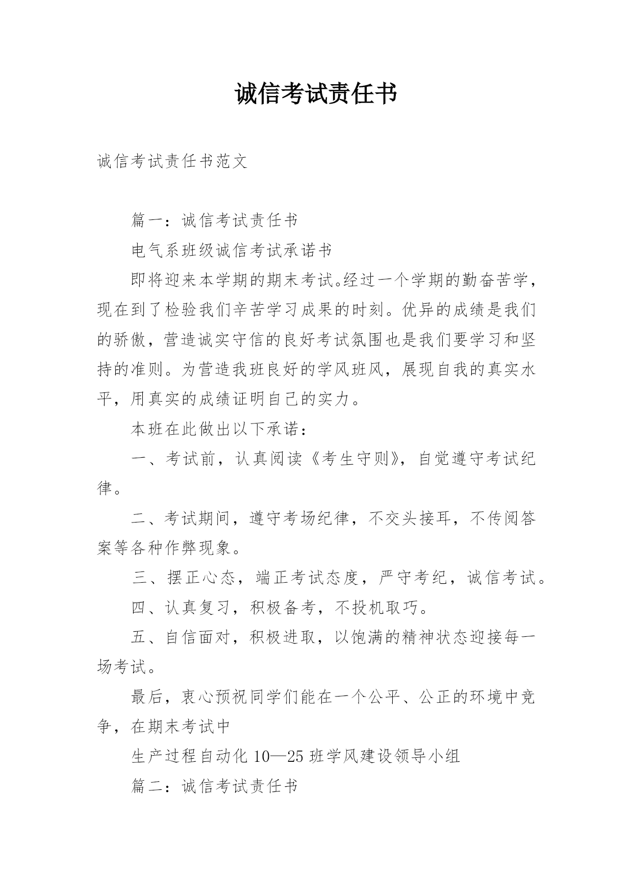 诚信考试责任书诚信考试责任书范文篇一:诚信考试责任书电气系班级诚信考试承诺书即将迎来本学期的期末考试。经过一个学期的勤奋苦学,现在到了检验我们辛苦学习成果的时刻。优异的成绩是我们的骄傲,营造诚实守信的良好考试氛围也是我们要学习和坚持的准则。为营造我班良好的学风班风,展现自我的真实水平,用真实的成绩证明自己的实力。本班在此做出以下承诺:一、考试前,认真阅读《考生守则》,自觉遵守考试纪律。二、考试期间,遵守考场纪律,不交头接耳,不传阅答案等各种作弊现象。三、摆正心态,端正考试态度,严守考纪,诚信考试。四、认真