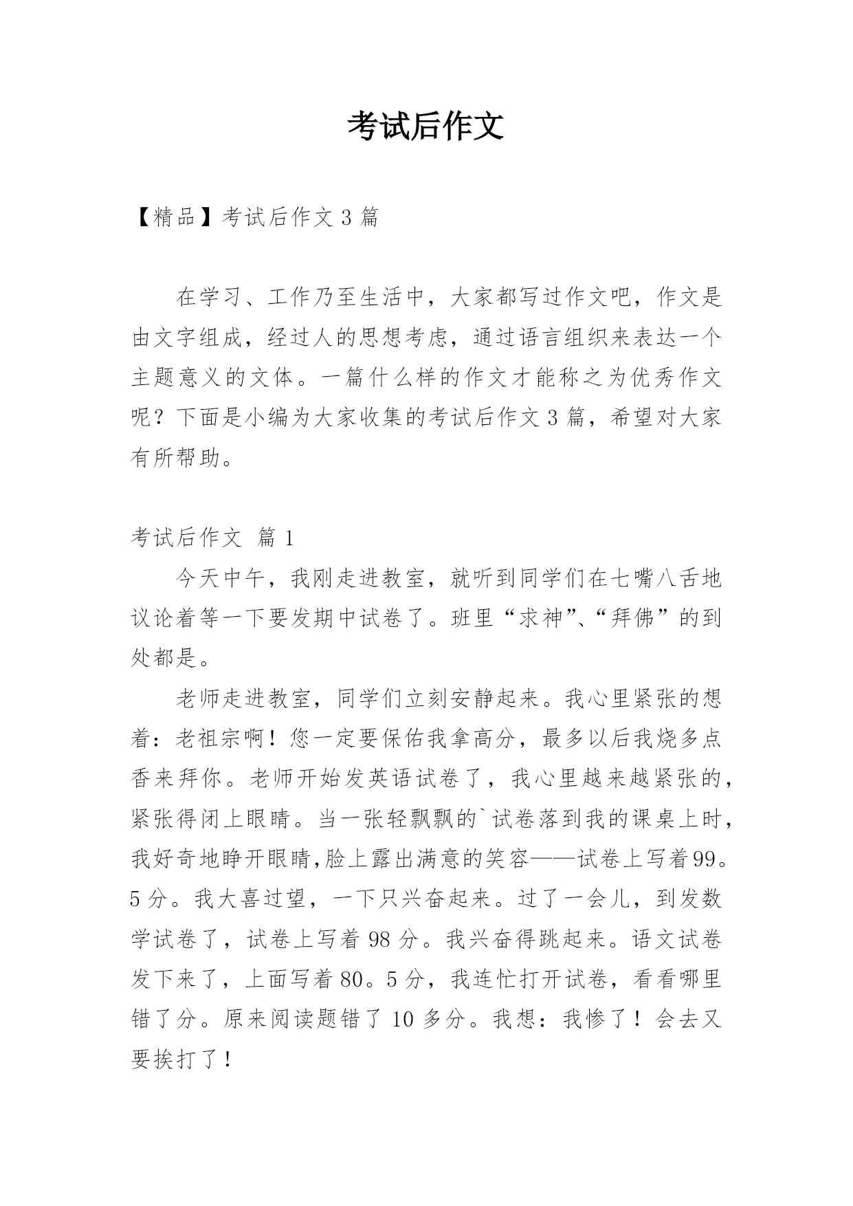 考试后作文【精品】考试后作文3篇在学习、工作乃至生活中,大家都写过作文吧,作文是由文字组成,经过人的思想考虑,通过语言组织来表达一个主题意义的文体。一篇什么样的作文才能称之为优秀作文呢?下面是小编为大家收集的考试后作文3篇,希望对大家有所帮助。考试后作文篇1今天中午,我刚走进教室,就听到同学们在七嘴八舌地议论着等一下要发期中试卷了。班里“求神”、“拜佛”的到处都是。老师走进教室,同学们立刻安静起来。我心里紧张的想着:老祖宗啊!您一定要保佑我拿高分,最多以后我烧多点香来拜你。老师开始发英语试卷了,我心里越来