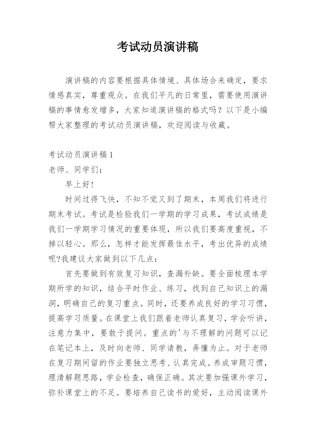 考试动员演讲稿演讲稿的内容要根据具体情境、具体场合来确定,要求情感真实,尊重观众。在我们平凡的日常里,需要使用演讲稿的事情愈发增多,大家知道演讲稿的格式吗?以下是小编帮大家整理的考试动员演讲稿,欢迎阅读与收藏。考试动员演讲稿1老师、同学们:早上好!时间过得飞快,不知不觉又到了期末,本周我们将进行期末考试。考试是检验我们一学期的学习成果,考试成绩是我们一学期学习情况的重要体现,所以我们要高度重视,不掉以轻心。那么,怎样才能发挥最佳水平,考出优异的成绩呢?我建议大家做到以下几点:首先要做到有效复习知识,查漏补