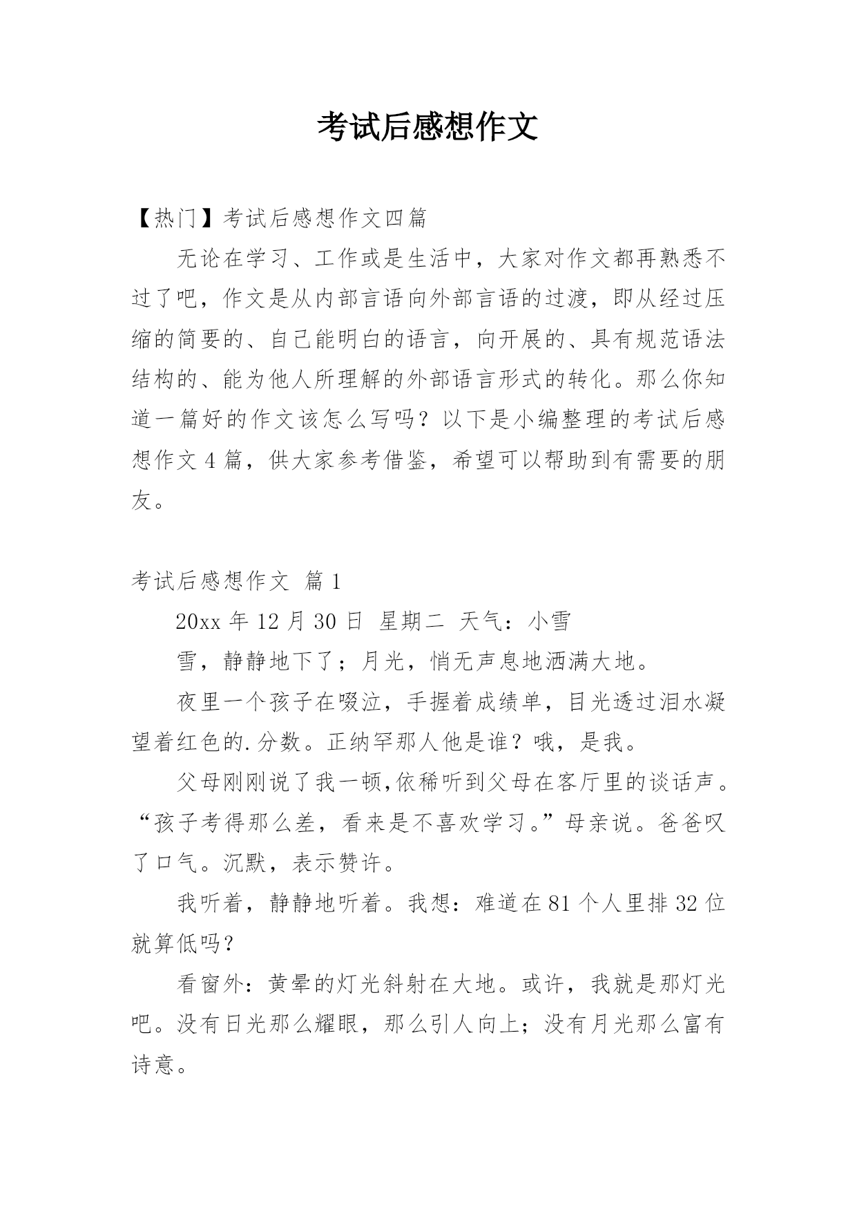 考试后感想作文【热门】考试后感想作文四篇无论在学习、工作或是生活中,大家对作文都再熟悉不过了吧,作文是从内部言语向外部言语的过渡,即从经过压缩的简要的、自己能明白的语言,向开展的、具有规范语法结构的、能为他人所理解的外部语言形式的转化。那么你知道一篇好的作文该怎么写吗?以下是小编整理的考试后感想作文4篇,供大家参考借鉴,希望可以帮助到有需要的朋友。考试后感想作文篇120xx年12月30日星期二天气:小雪雪,静静地下了;月光,悄无声息地洒满大地。夜里一个孩子在啜泣,手握着成绩单,目光透过泪水凝望着红色的.分