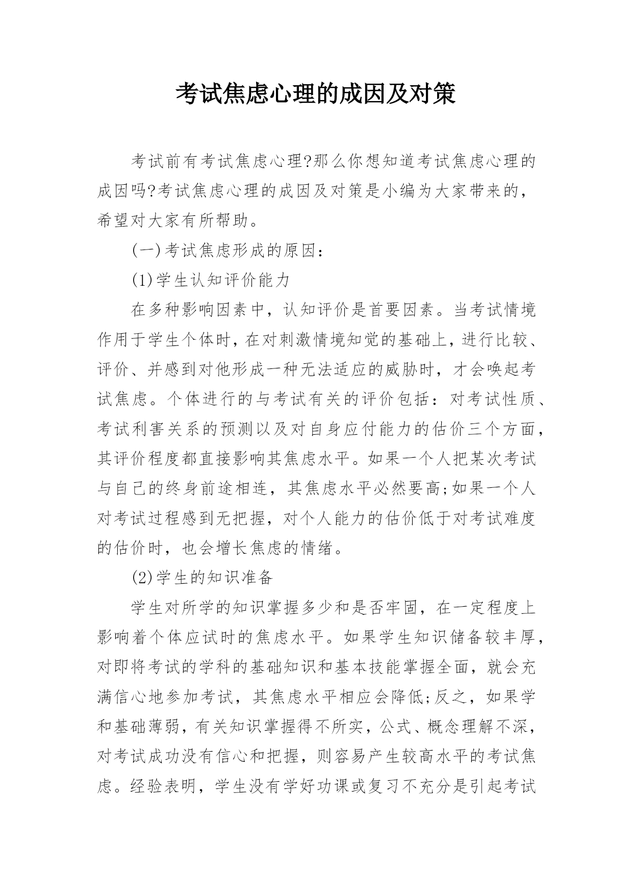 考试焦虑心理的成因及对策考试前有考试焦虑心理?那么你想知道考试焦虑心理的成因吗?考试焦虑心理的成因及对策是小编为大家带来的,希望对大家有所帮助。(一)考试焦虑形成的原因:(1)学生认知评价能力在多种影响因素中,认知评价是首要因素。当考试情境作用于学生个体时,在对刺激情境知觉的基础上,进行比较、评价、并感到对他形成一种无法适应的威胁时,才会唤起考试焦虑。个体进行的与考试有关的评价包括:对考试性质、考试利害关系的预测以及对自身应付能力的估价三个方面,其评价程度都直接影响其焦虑水平。如果一个人把某次考试与自己的