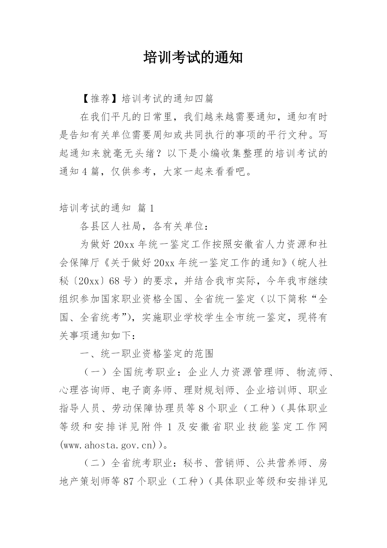 培训考试的通知【推荐】培训考试的通知四篇在我们平凡的日常里,我们越来越需要通知,通知有时是告知有关单位需要周知或共同执行的事项的平行文种。写起通知来就毫无头绪?以下是小编收集整理的培训考试的通知4篇,仅供参考,大家一起来看看吧。培训考试的通知篇1各县区人社局,各有关单位:为做好20xx年统一鉴定工作按照安徽省人力资源和社会保障厅《关于做好20xx年统一鉴定工作的通知》(皖人社秘〔20xx〕68号)的要求,并结合我市实际,今年我市继续组织参加国家职业资格全国、全省统一鉴定(以下简称“全国、全省统考”),实施