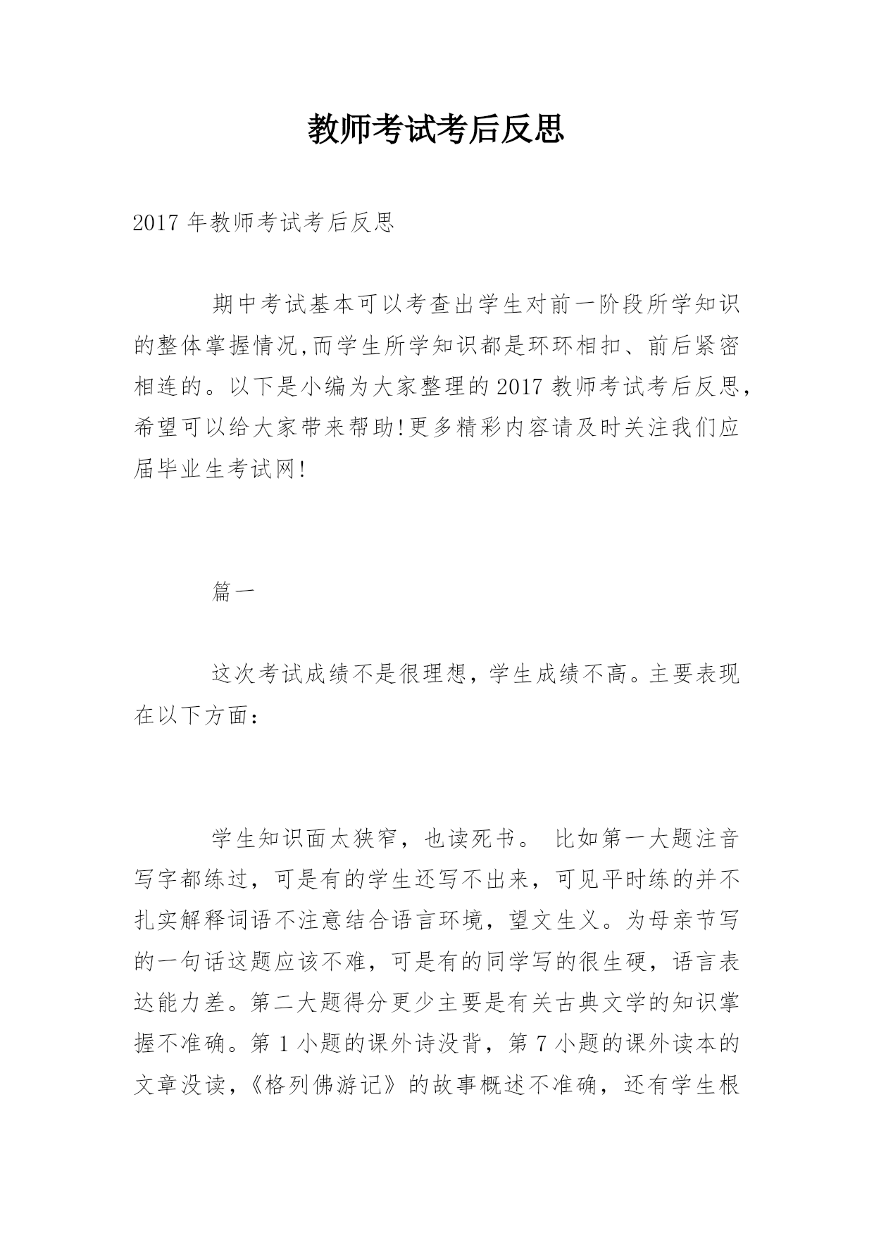 教师考试考后反思2017年教师考试考后反思期中考试基本可以考查出学生对前一阶段所学知识的整体掌握情况,而学生所学知识都是环环相扣、前后紧密相连的。以下是小编为大家整理的2017教师考试考后反思,希望可以给大家带来帮助!更多精彩内容请及时关注我们应届毕业生考试网!篇一这次考试成绩不是很理想,学生成绩不高。主要表现在以下方面:学生知识面太狭窄,也读死书。比如第一大题注音写字都练过,可是有的学生还写不出来,可见平时练的并不扎实解释词语不注意结合语言环境,望文生义。为母亲节写的一句话这题应该不难,可是有的同学写的