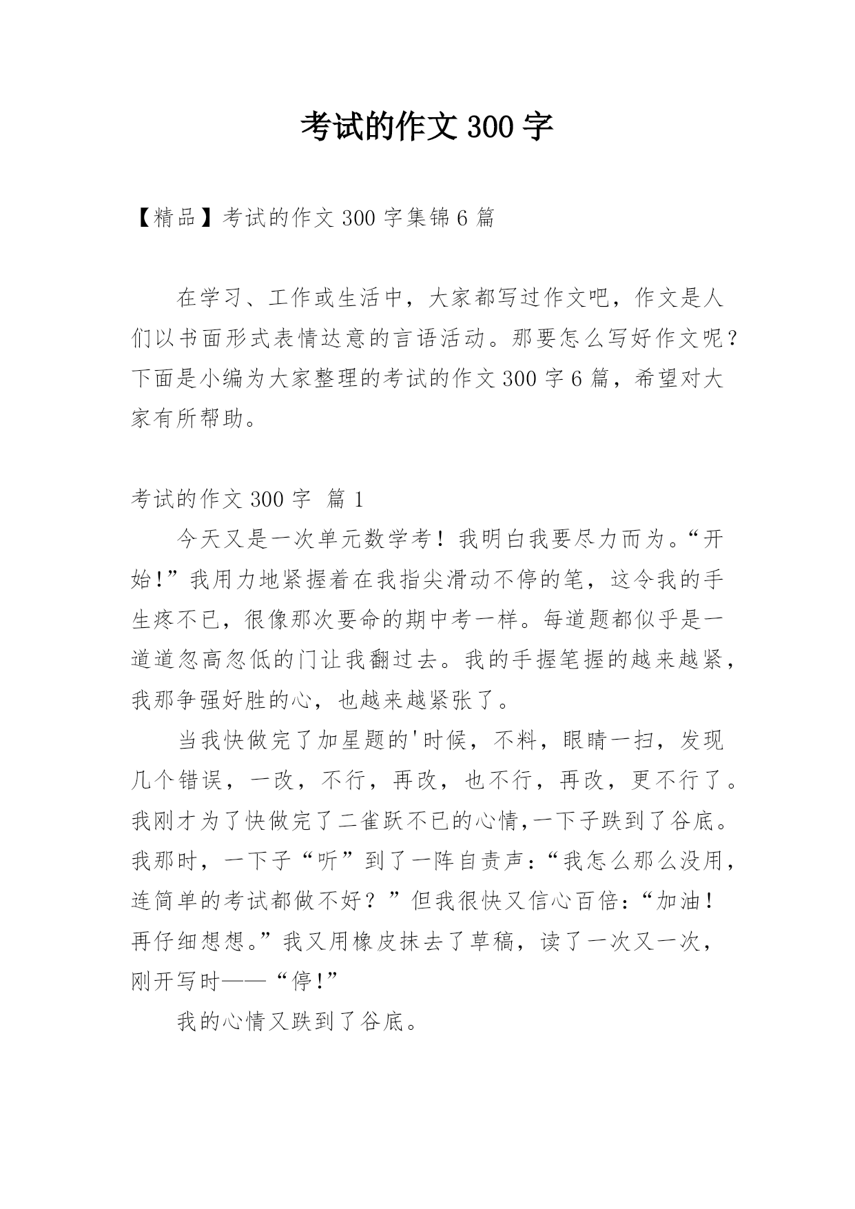 考试的作文300字【精品】考试的作文300字集锦6篇在学习、工作或生活中,大家都写过作文吧,作文是人们以书面形式表情达意的言语活动。那要怎么写好作文呢?下面是小编为大家整理的考试的作文300字6篇,希望对大家有所帮助。考试的作文300字篇1今天又是一次单元数学考!我明白我要尽力而为。“开始!”我用力地紧握着在我指尖滑动不停的笔,这令我的手生疼不已,很像那次要命的期中考一样。每道题都似乎是一道道忽高忽低的门让我翻过去。我的手握笔握的越来越紧,我那争强好胜的心,也越来越紧张了。当我快做完了加星题的'时候,不料