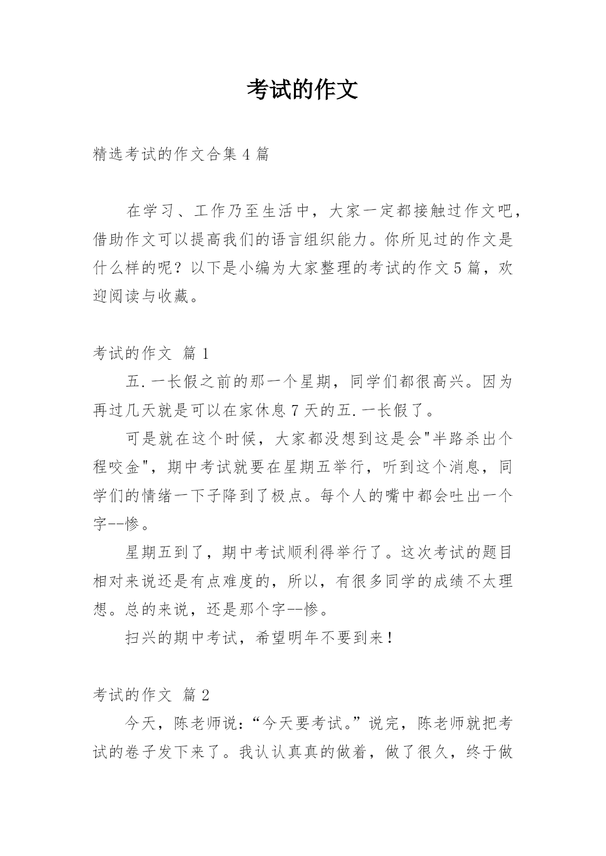 考试的作文精选考试的作文合集4篇在学习、工作乃至生活中,大家一定都接触过作文吧,借助作文可以提高我们的语言组织能力。你所见过的作文是什么样的呢?以下是小编为大家整理的考试的作文5篇,欢迎阅读与收藏。考试的作文篇1五.一长假之前的那一个星期,同学们都很高兴。因为再过几天就是可以在家休息7天的五.一长假了。可是就在这个时候,大家都没想到这是会"半路杀出个程咬金",期中考试就要在星期五举行,听到这个消息,同学们的情绪一下子降到了极点。每个人的嘴中都会吐出一个字--惨。星期五到了,期中考试顺利得举行了。这次考试的
