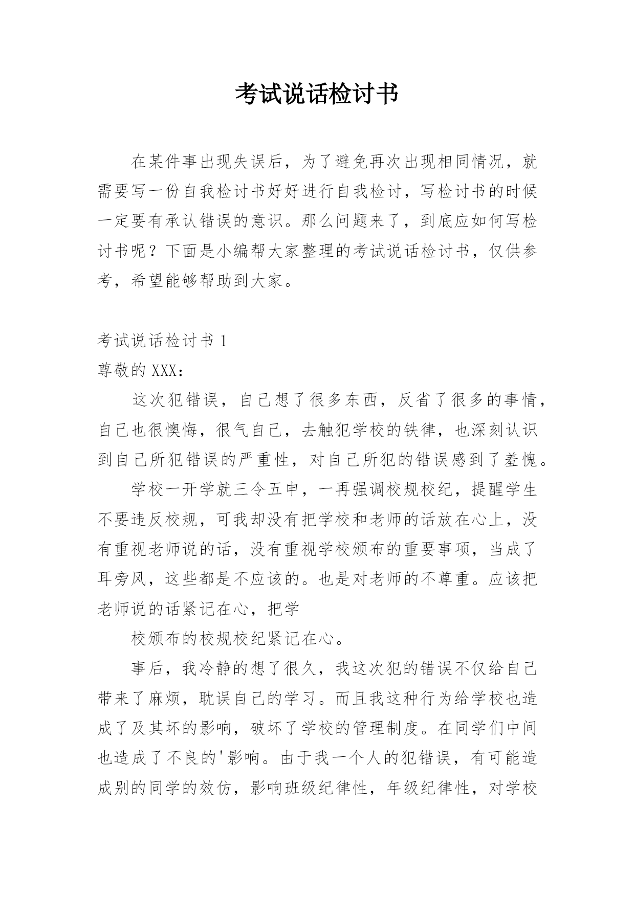 考试说话检讨书在某件事出现失误后,为了避免再次出现相同情况,就需要写一份自我检讨书好好进行自我检讨,写检讨书的时候一定要有承认错误的意识。那么问题来了,到底应如何写检讨书呢?下面是小编帮大家整理的考试说话检讨书,仅供参考,希望能够帮助到大家。考试说话检讨书1尊敬的XXX:这次犯错误,自己想了很多东西,反省了很多的事情,自己也很懊悔,很气自己,去触犯学校的铁律,也深刻认识到自己所犯错误的严重性,对自己所犯的错误感到了羞愧。学校一开学就三令五申,一再强调校规校纪,提醒学生不要违反校规,可我却没有把学校和老师的