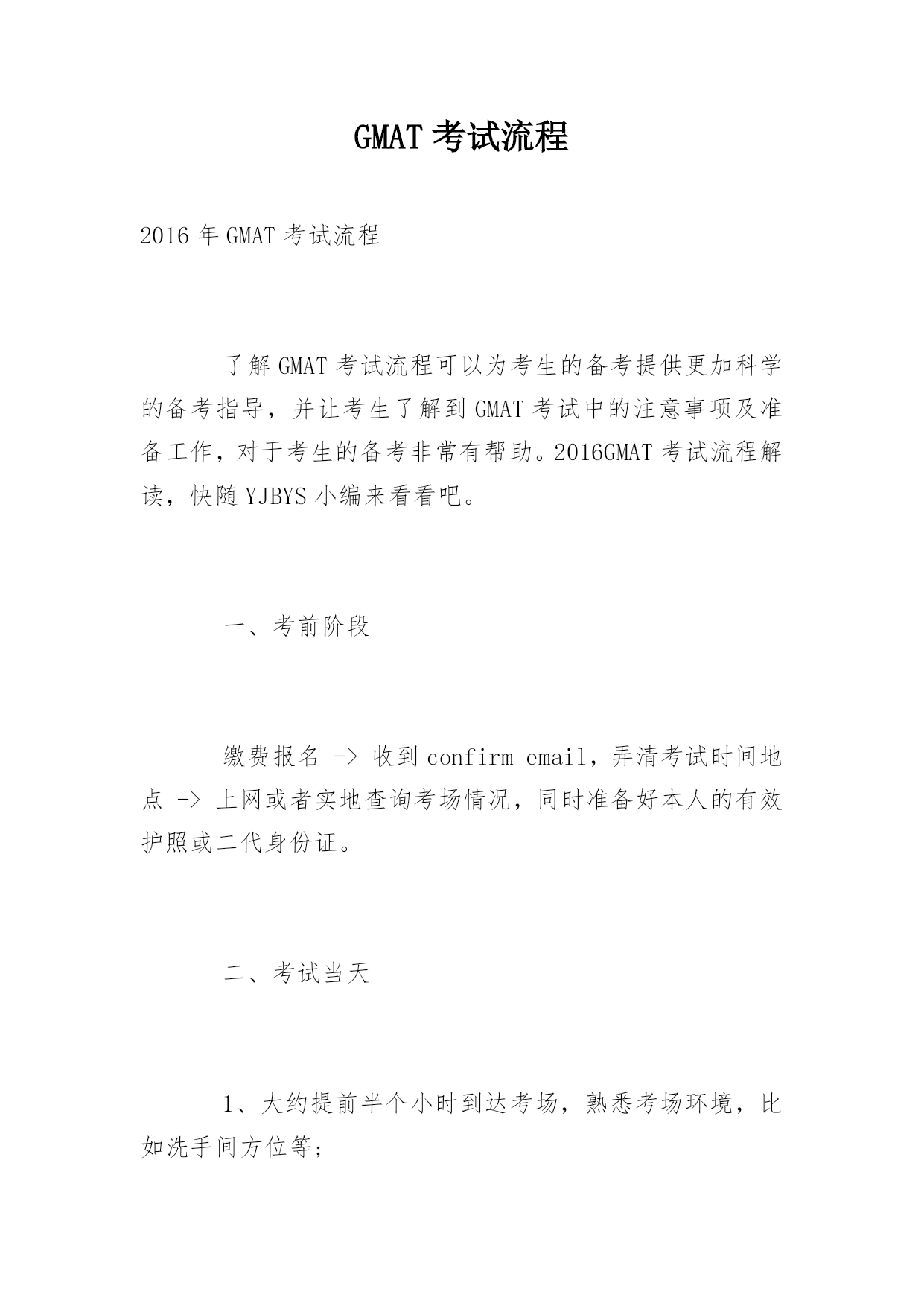 GMAT考试流程2016年GMAT考试流程了解GMAT考试流程可以为考生的备考提供更加科学的备考指导,并让考生了解到GMAT考试中的注意事项及准备工作,对于考生的备考非常有帮助。2016GMAT考试流程解读,快随YJBYS小编来看看吧。一、考前阶段缴费报名->收到confirmemail,弄清考试时间地点->上网或者实地查询考场情况,同时准备好本人的有效护照或二代身份证。二、考试当天1、大约提前半个小时到达考场,熟悉考场环境,比如洗手间方位等;2、在候考区等候,按照监考人员的指示上交有效护照或二代身份证,