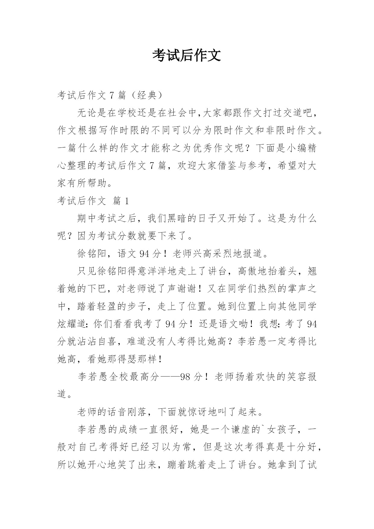 考试后作文考试后作文7篇(经典)无论是在学校还是在社会中,大家都跟作文打过交道吧,作文根据写作时限的不同可以分为限时作文和非限时作文。一篇什么样的作文才能称之为优秀作文呢?下面是小编精心整理的考试后作文7篇,欢迎大家借鉴与参考,希望对大家有所帮助。考试后作文篇1期中考试之后,我们黑暗的日子又开始了。这是为什么呢?因为考试分数就要下来了。徐铭阳,语文94分!老师兴高采烈地报道。只见徐铭阳得意洋洋地走上了讲台,高傲地抬着头,翘着她的下巴,对老师说了声谢谢!又在同学们热烈的掌声之中,踏着轻盈的步子,走上了位置。