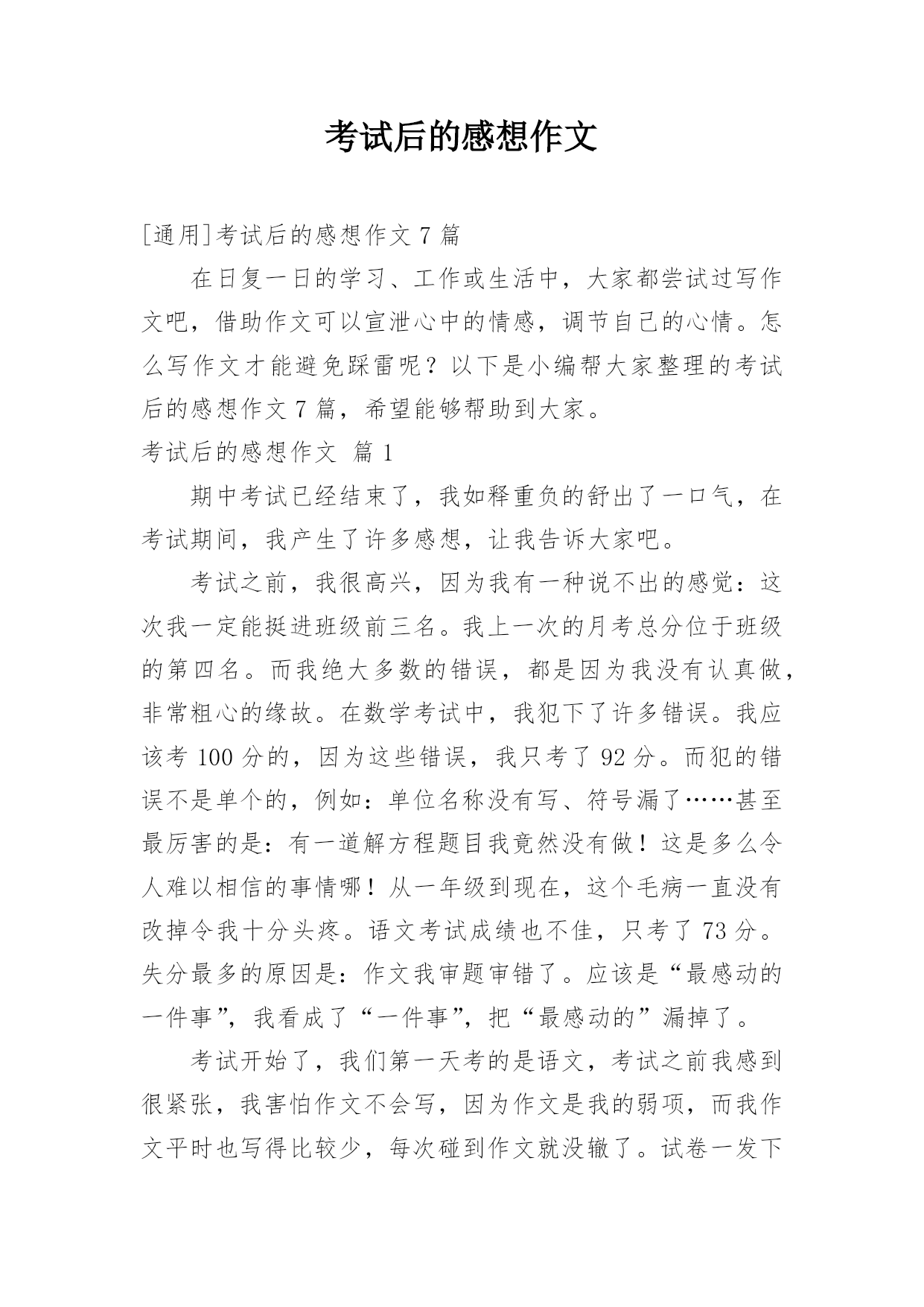 考试后的感想作文[通用]考试后的感想作文7篇在日复一日的学习、工作或生活中,大家都尝试过写作文吧,借助作文可以宣泄心中的情感,调节自己的心情。怎么写作文才能避免踩雷呢?以下是小编帮大家整理的考试后的感想作文7篇,希望能够帮助到大家。考试后的感想作文篇1期中考试已经结束了,我如释重负的舒出了一口气,在考试期间,我产生了许多感想,让我告诉大家吧。考试之前,我很高兴,因为我有一种说不出的感觉:这次我一定能挺进班级前三名。我上一次的月考总分位于班级的第四名。而我绝大多数的错误,都是因为我没有认真做,非常粗心的缘故