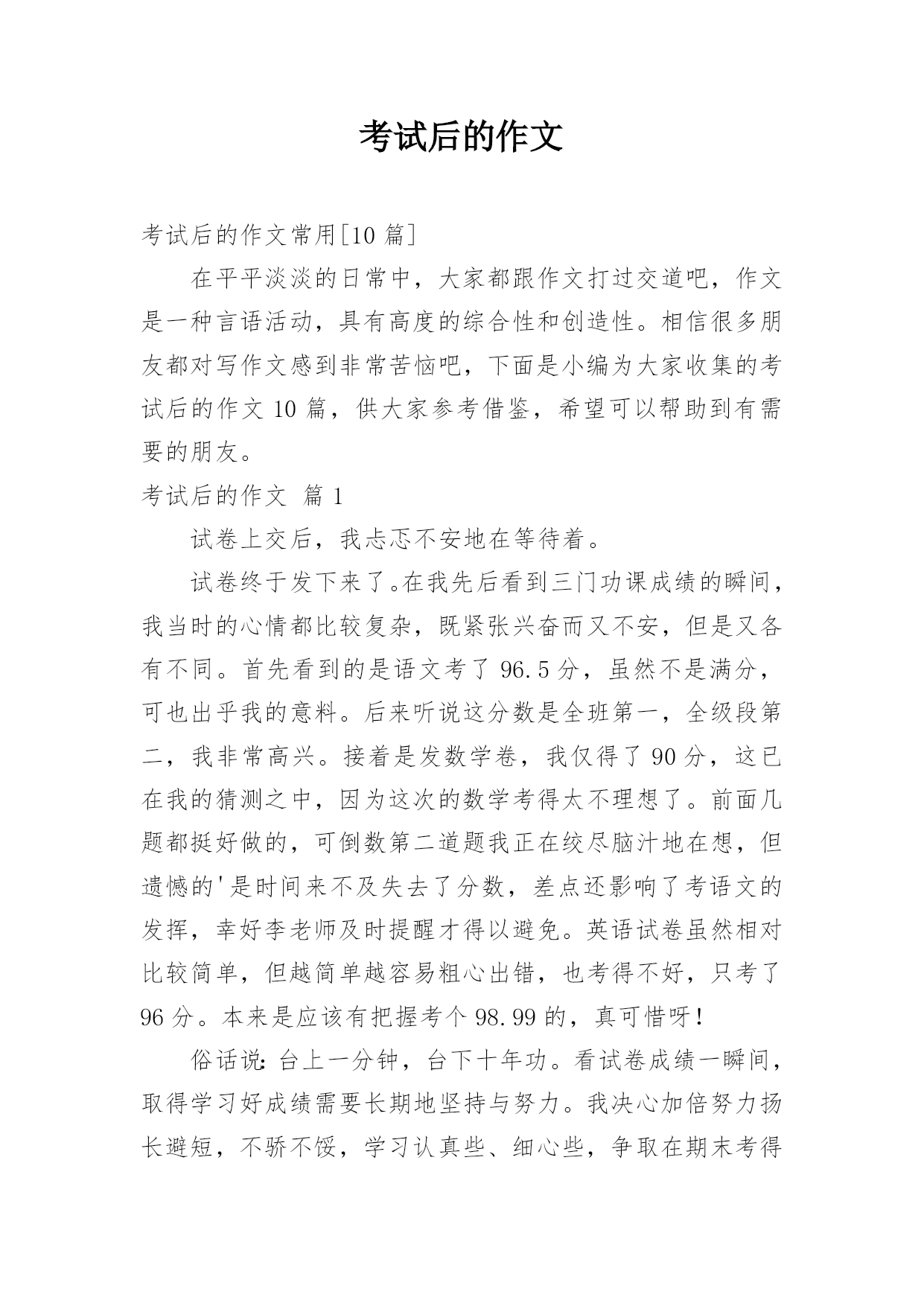 考试后的作文考试后的作文常用[10篇]在平平淡淡的日常中,大家都跟作文打过交道吧,作文是一种言语活动,具有高度的综合性和创造性。相信很多朋友都对写作文感到非常苦恼吧,下面是小编为大家收集的考试后的作文10篇,供大家参考借鉴,希望可以帮助到有需要的朋友。考试后的作文篇1试卷上交后,我忐忑不安地在等待着。试卷终于发下来了。在我先后看到三门功课成绩的瞬间,我当时的心情都比较复杂,既紧张兴奋而又不安,但是又各有不同。首先看到的是语文考了96.5分,虽然不是满分,可也出乎我的意料。后来听说这分数是全班第一,全级段第