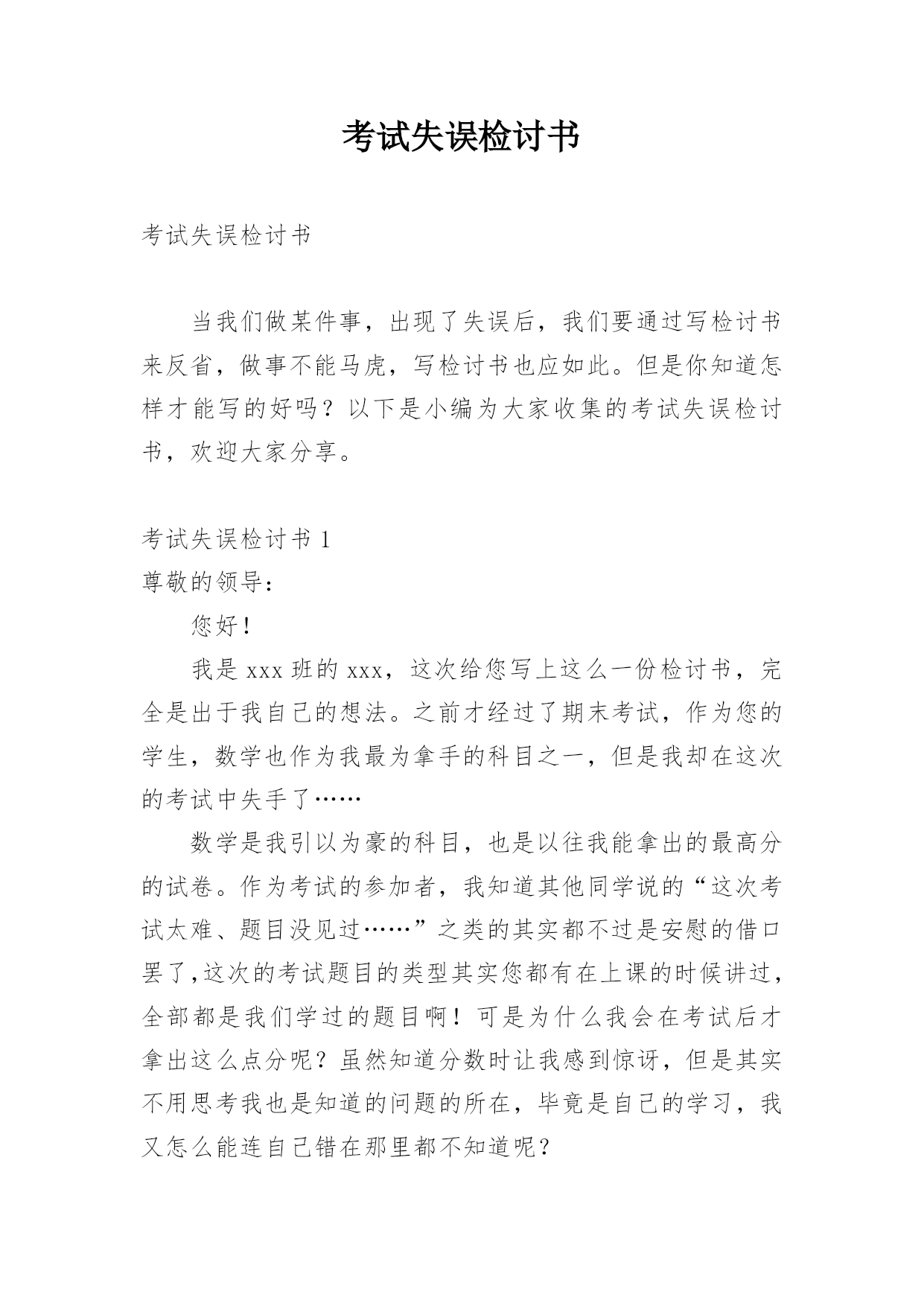 考试失误检讨书考试失误检讨书当我们做某件事,出现了失误后,我们要通过写检讨书来反省,做事不能马虎,写检讨书也应如此。但是你知道怎样才能写的好吗?以下是小编为大家收集的考试失误检讨书,欢迎大家分享。考试失误检讨书1尊敬的领导:您好!我是xxx班的xxx,这次给您写上这么一份检讨书,完全是出于我自己的想法。之前才经过了期末考试,作为您的学生,数学也作为我最为拿手的科目之一,但是我却在这次的考试中失手了……数学是我引以为豪的科目,也是以往我能拿出的最高分的试卷。作为考试的参加者,我知道其他同学说的“这次考试太难